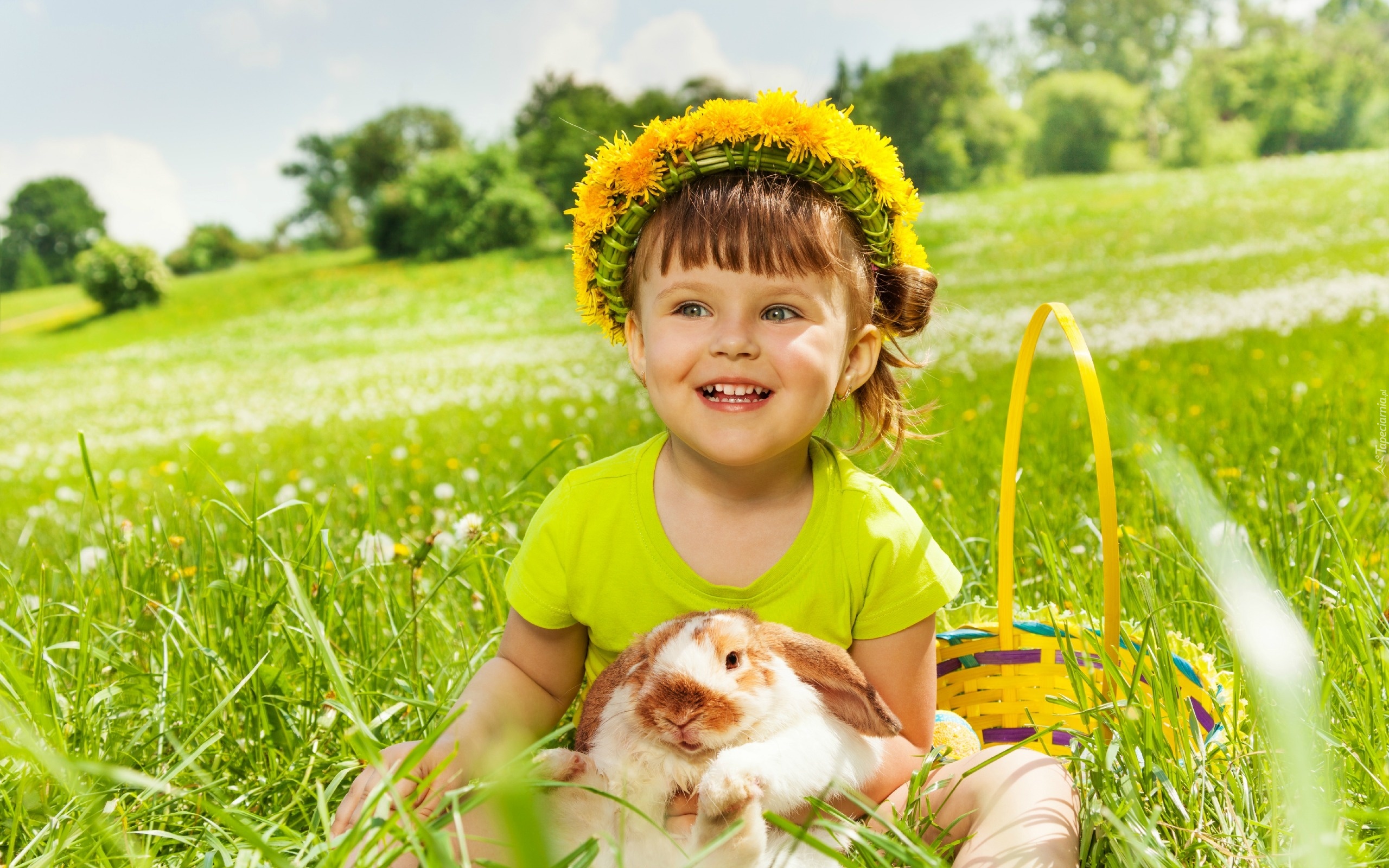 Edytor tapety: Dziewczynka, Łąka, Wianuszek, Mlecze, Królik, Koszyk