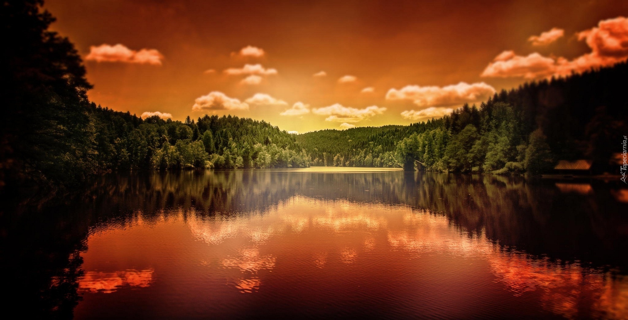 Edytor tapety: Zachód, Słońca, Lasy, Jezioro