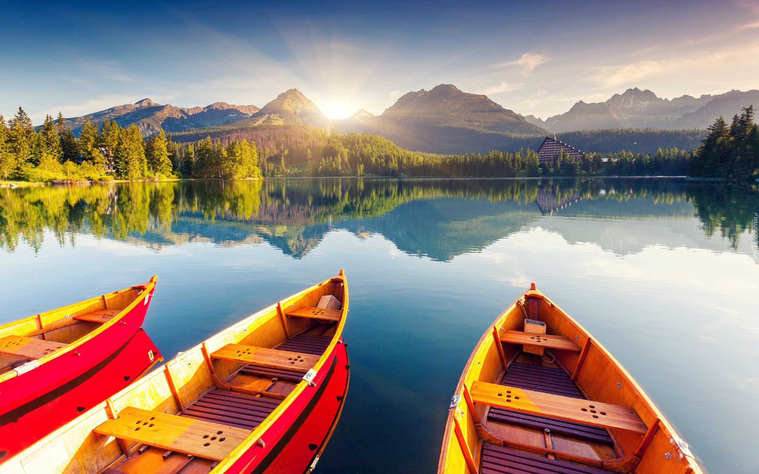 Edytor tapety: Jezioro, Łódki, Góry, Lasy, Promienie, Słońca