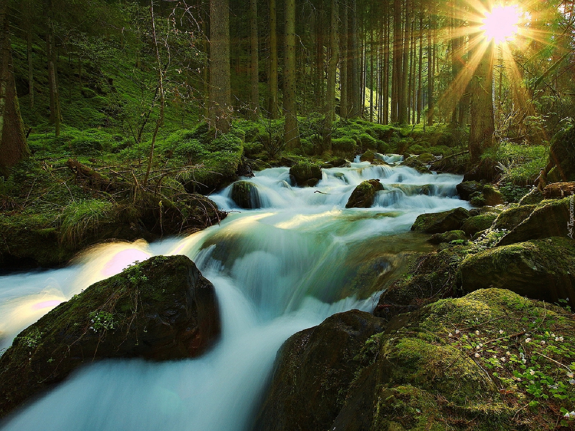Edytor tapety: Las, Promienie, Słońca, Kamienie, Strumyk