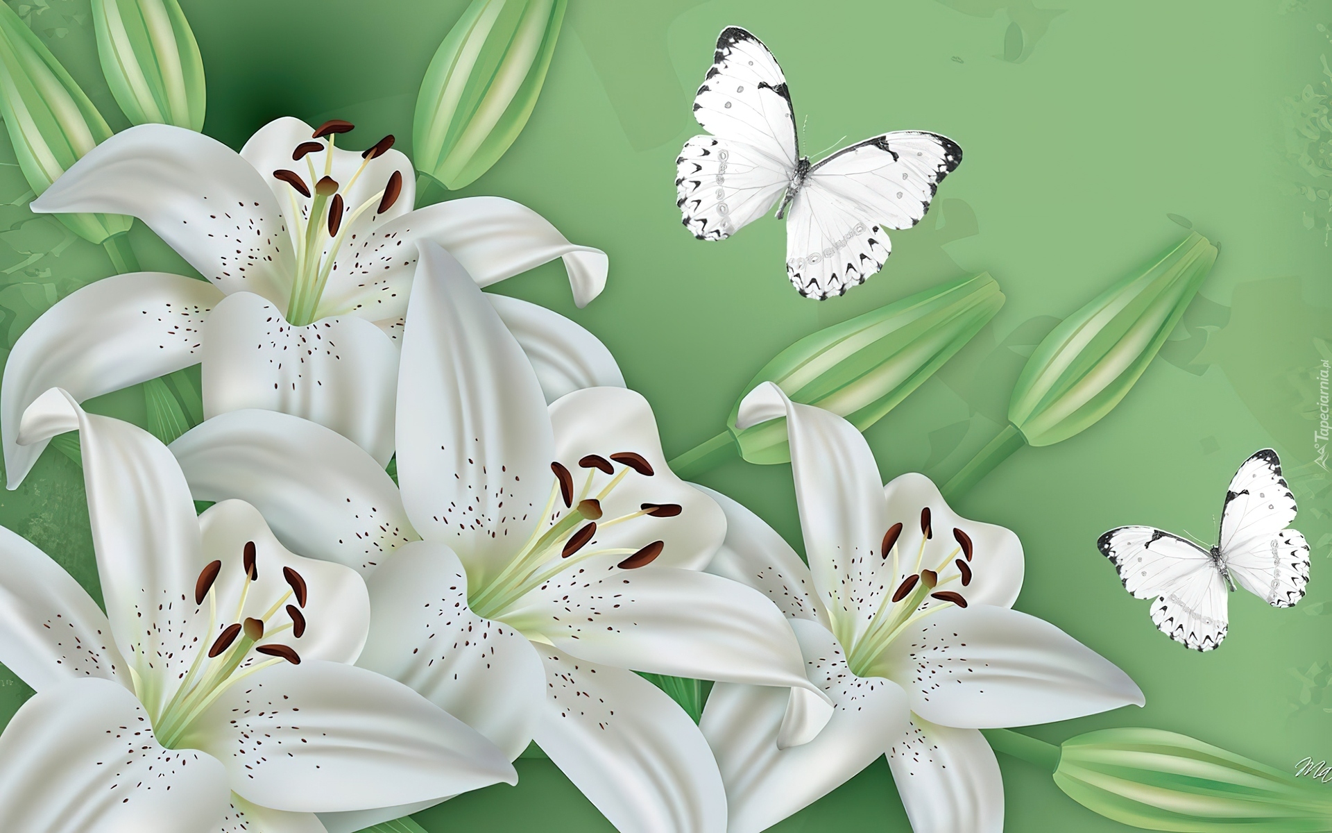 Edytor tapety: Grafika, Białe, Lilie, Motyle