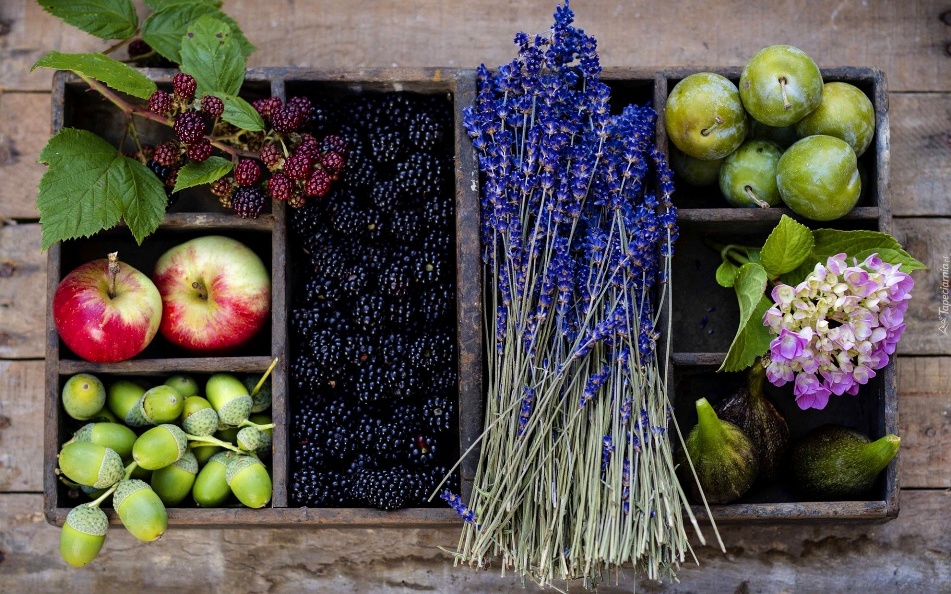 Edytor tapety: Skrzynka, Jabłka, Śliwki, Jeżyny, Żołędzie, Lawenda