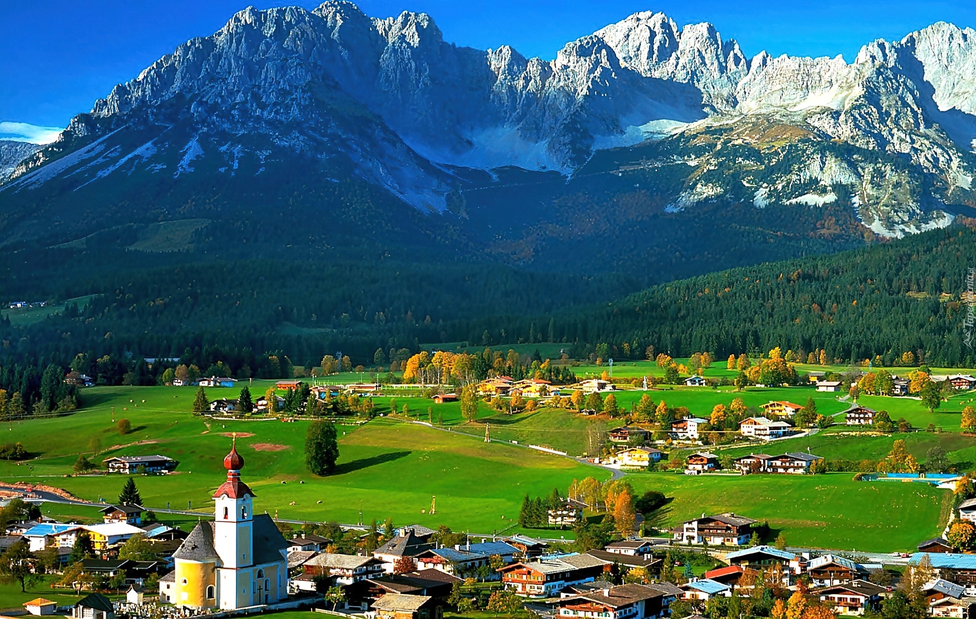 Edytor tapety: Alpy, Lasy, Łąki, Dolina, Wioska, Przebijające, Światło