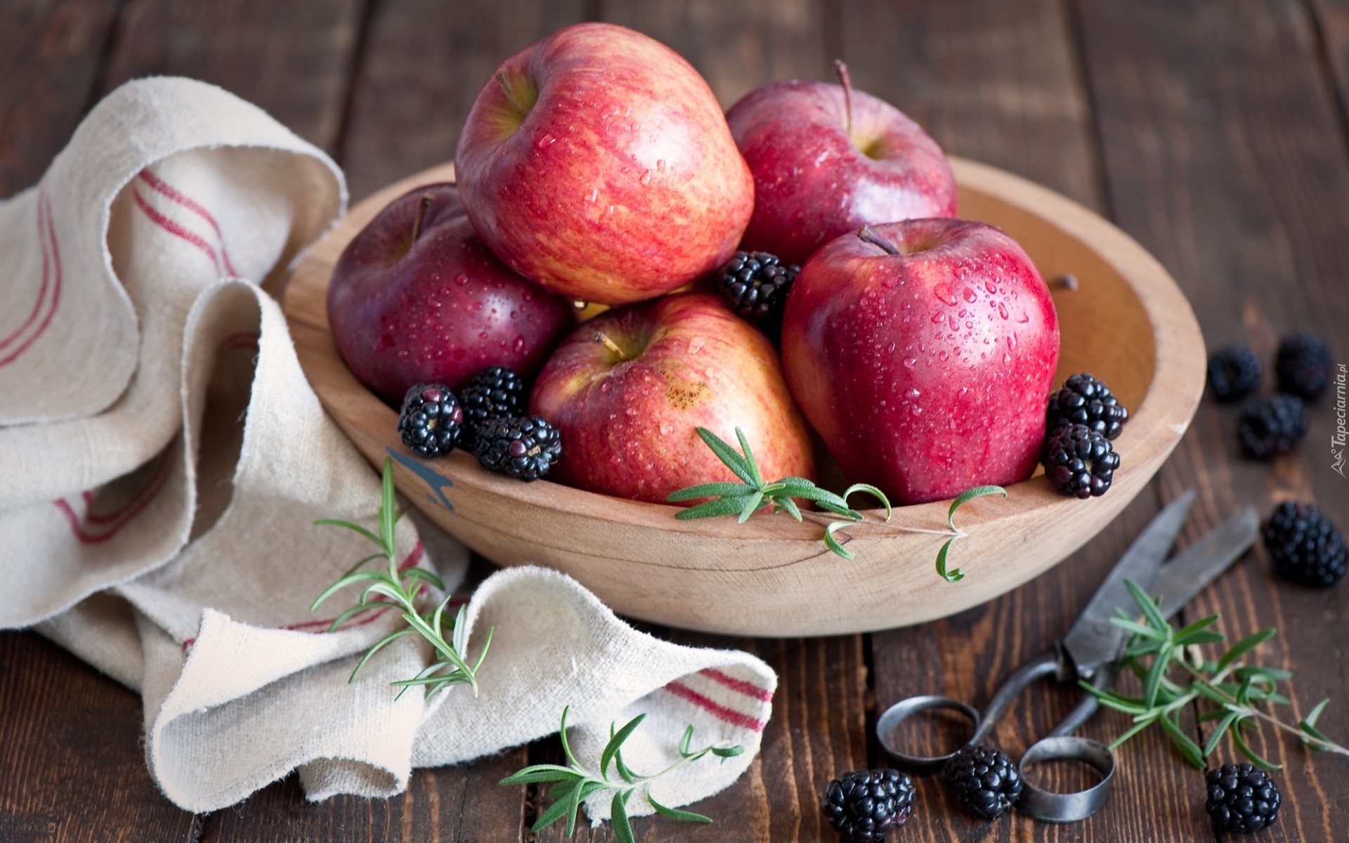 Edytor tapety: Miseczka, Jabłka, Jeżyny, Listki, Kompozycja
