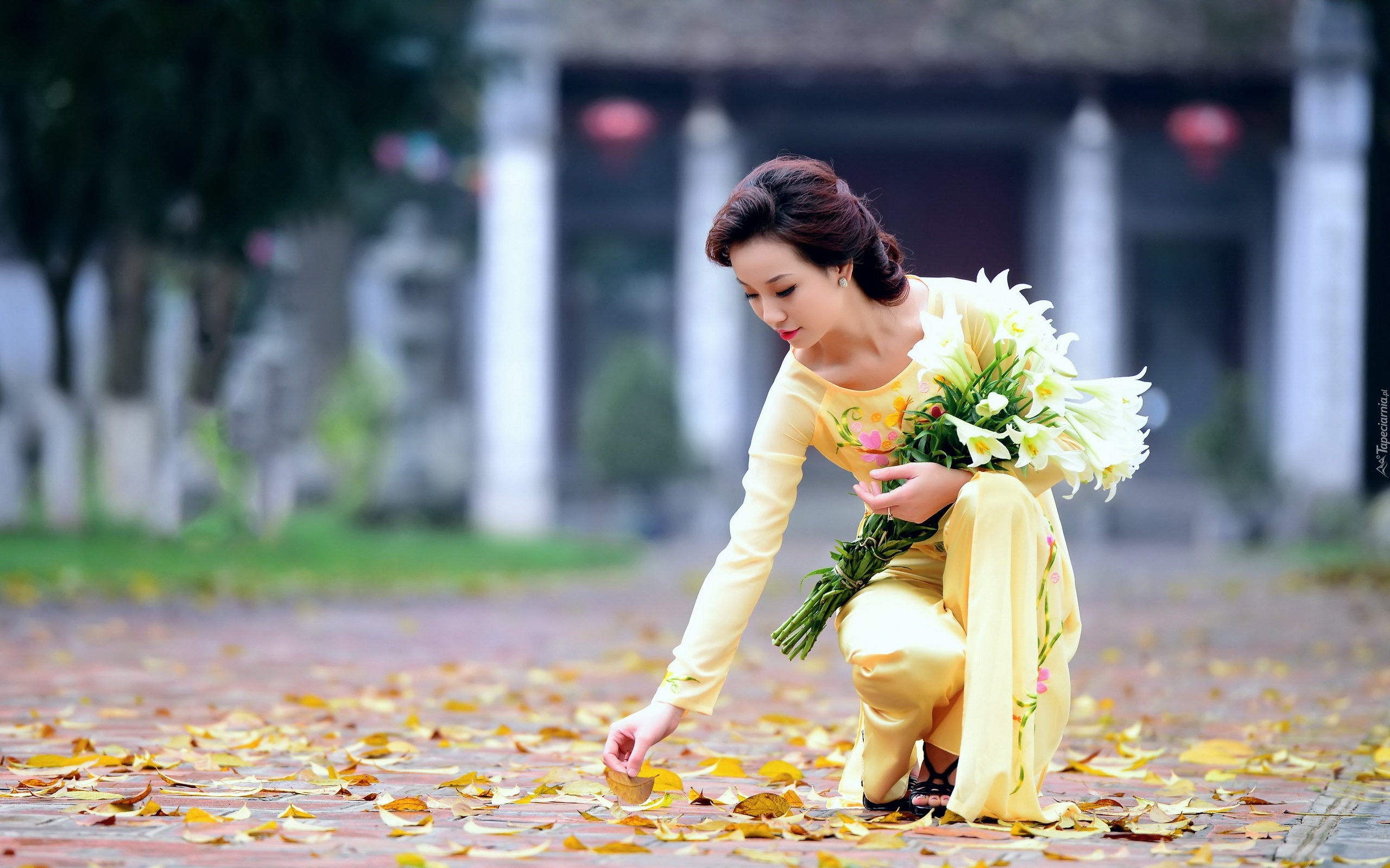 Edytor tapety: Orientalna, Kobieta, Bukiet, Kwiatów, Droga, Liście
