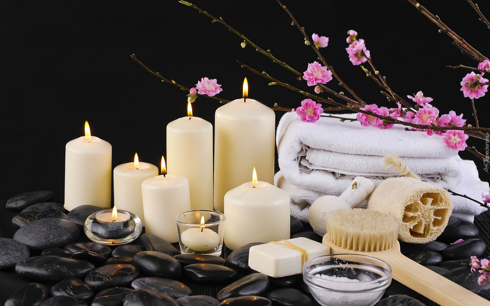 Edytor tapety: Kompozycja, Świece, Świeczki, Kamienie, Ręcznik, Mydło, Kwiatki, SPA