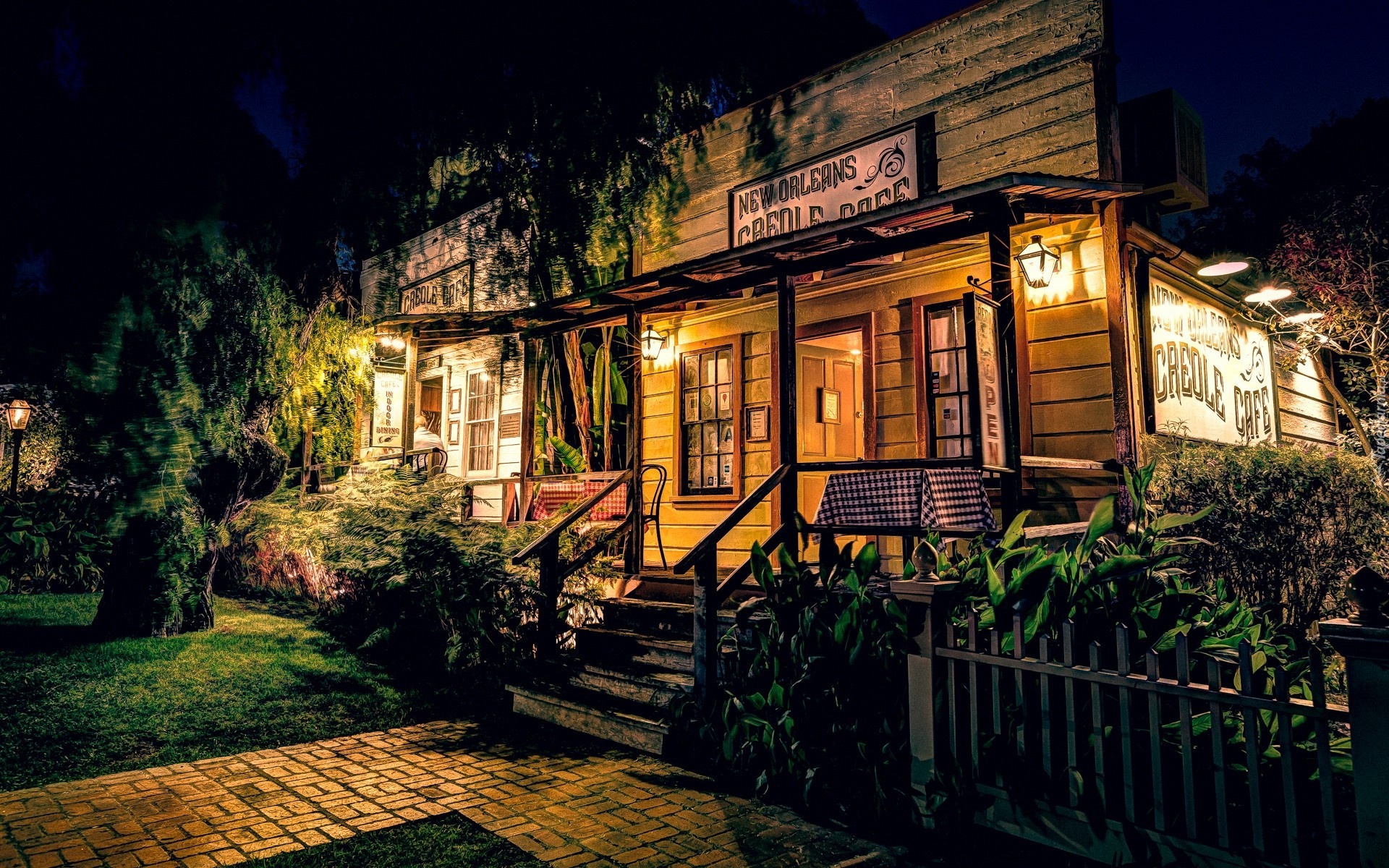 Edytor tapety: Restauracja, Dom, Schody, Stoliki, Drzewa, Ogródek