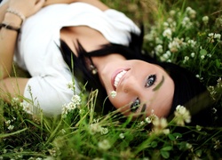 Edytor tapety: Uśmiechnięta, Kobieta, Trawa, Kwiaty