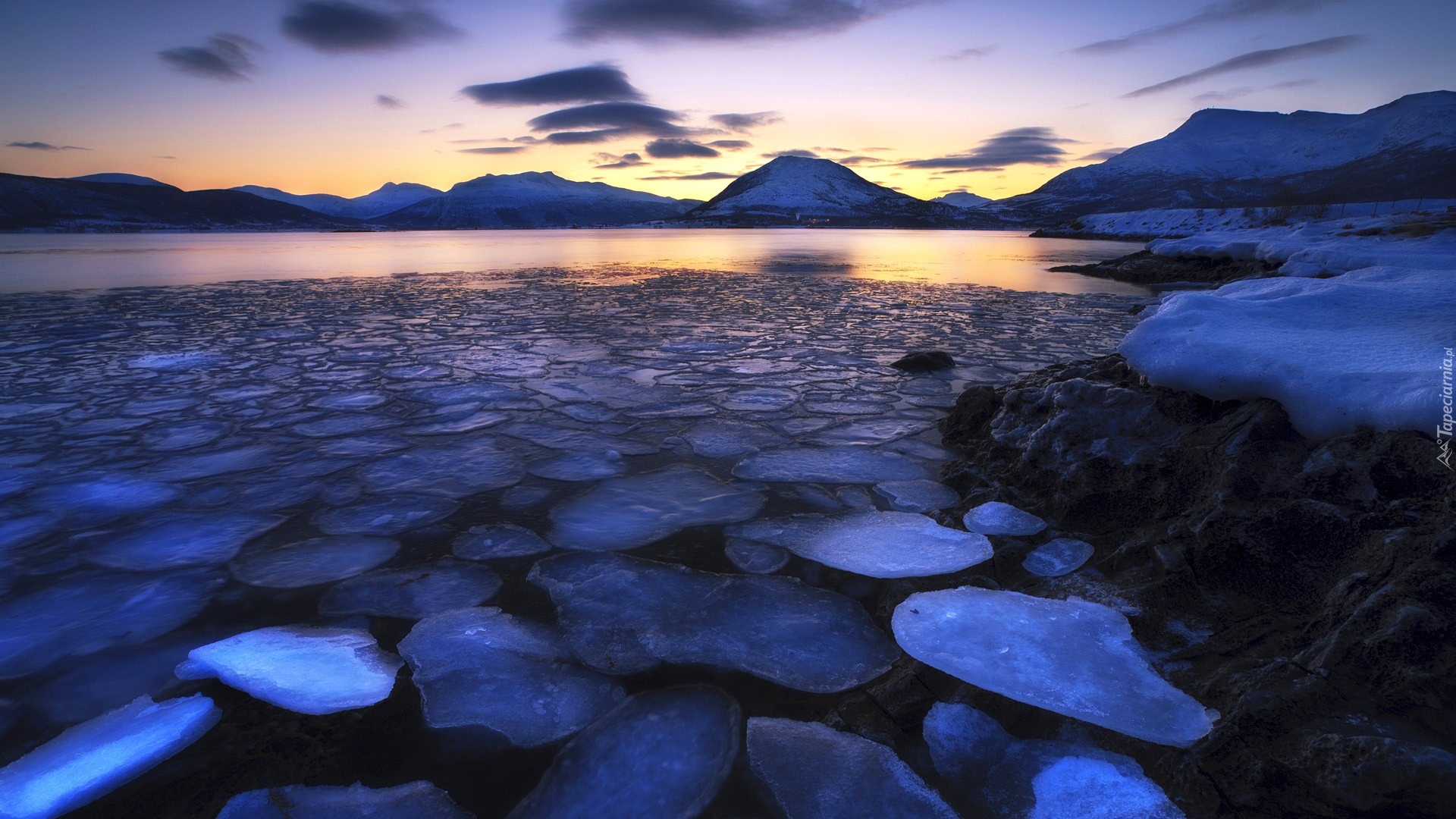 Edytor tapety: Jezioro, Góry, Skały, Kry, Lodowe, Wschód, Słońca, Zima