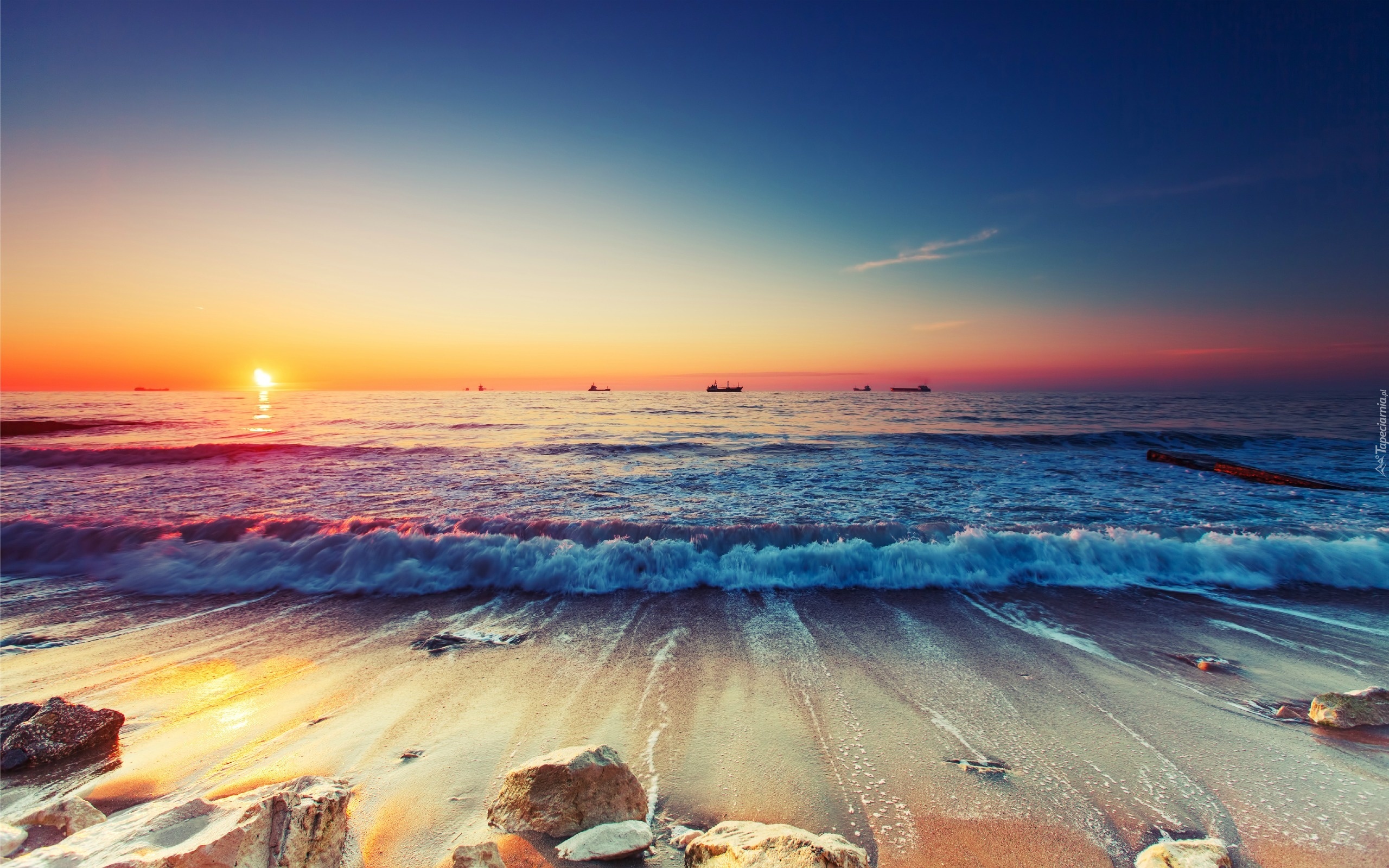 Edytor tapety: Morze, Fale, Statki, Plaża, Kamienie, Zachód, Słońca