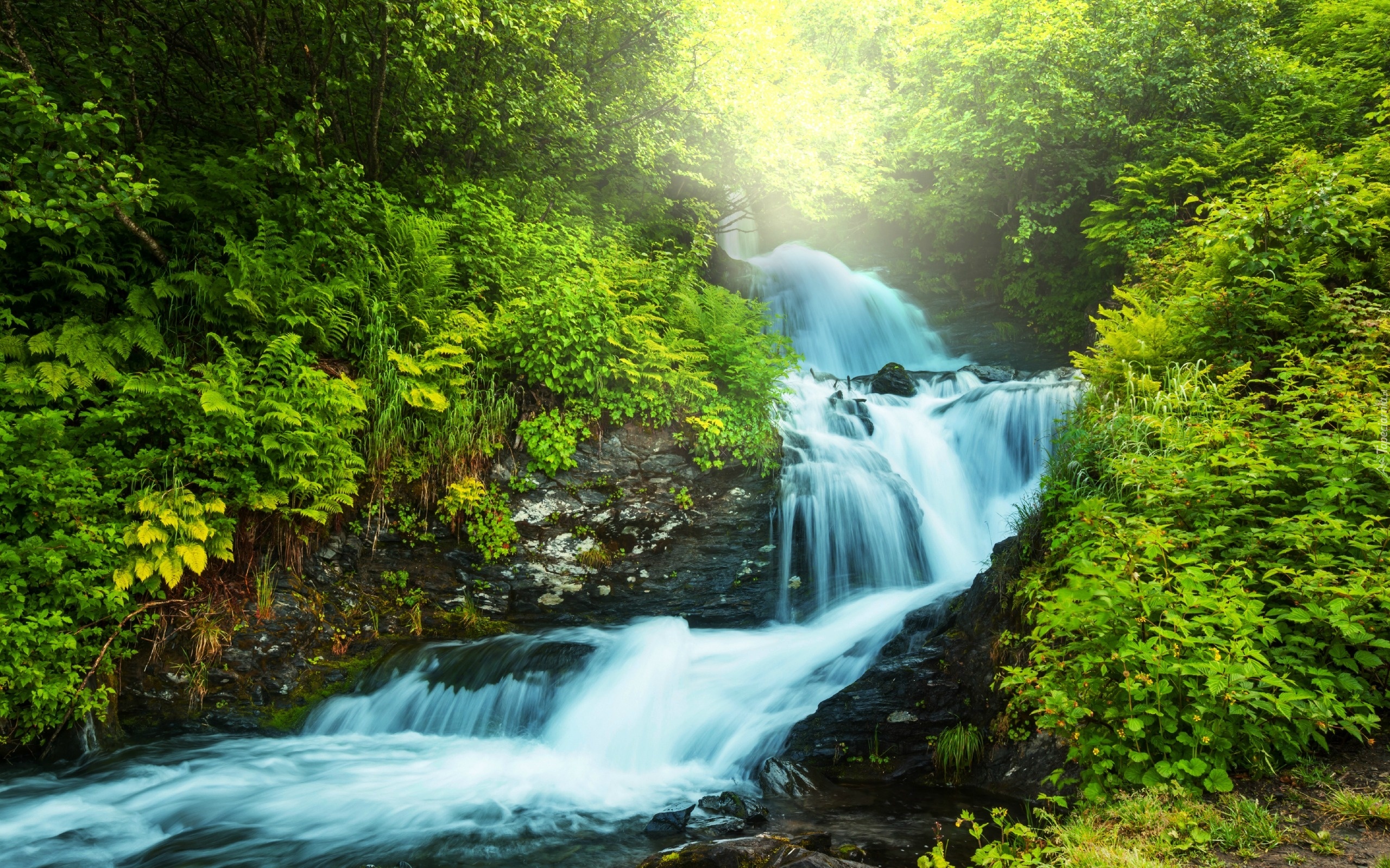 Edytor tapety: Wodospad, Skały, Las, Roślinność, Przebijające, Światło