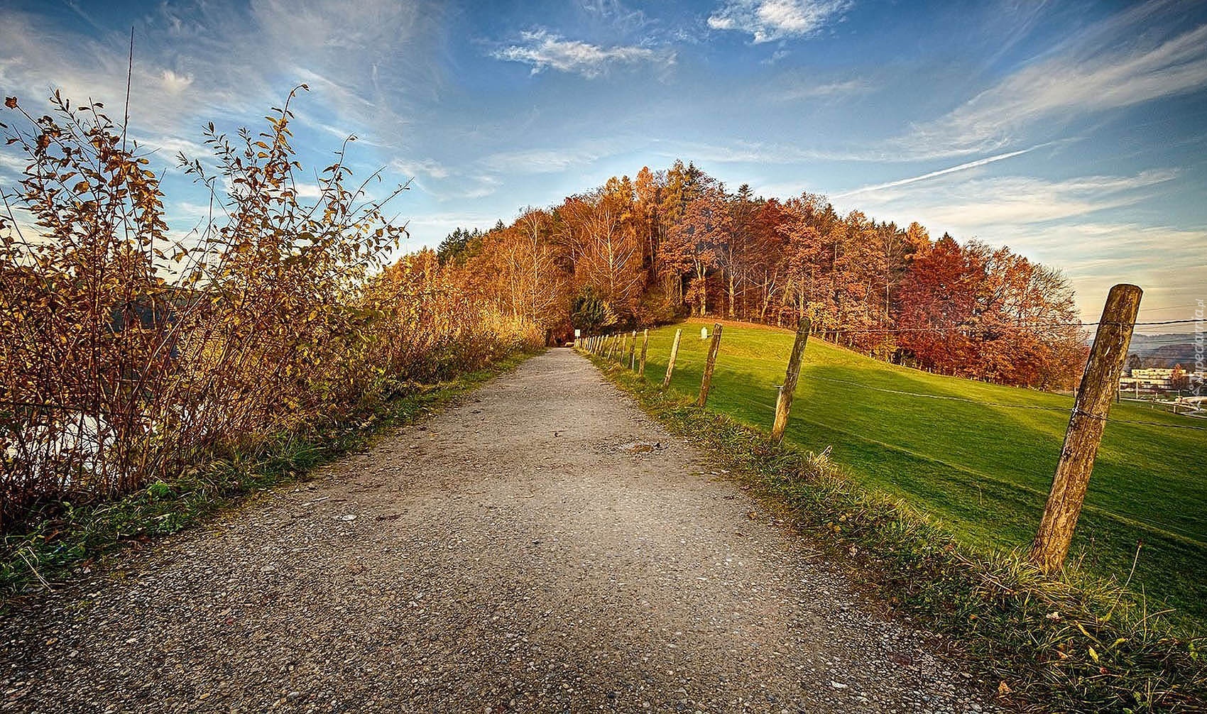Edytor tapety: Jesień, Droga, Pola, Drzewa, Krzewy, Ogrodzenie