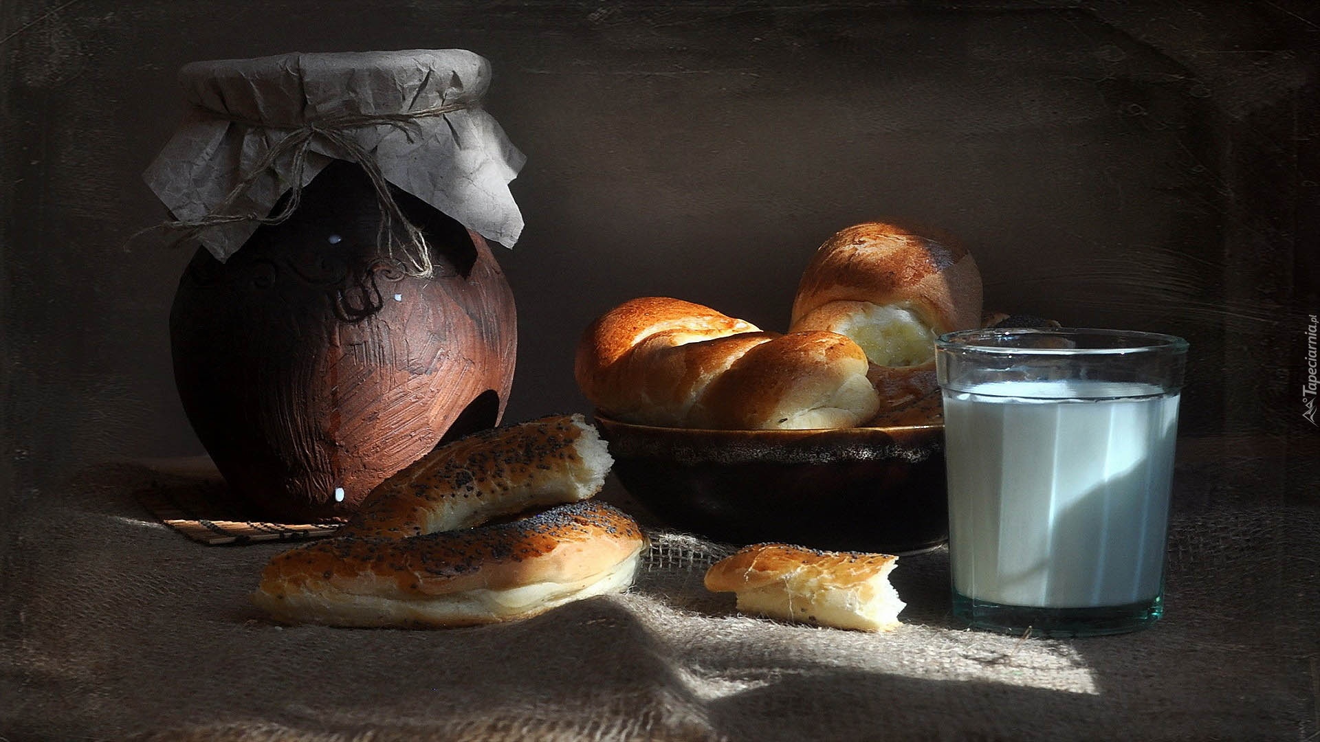 Edytor tapety: Śniadanie, Bułki, Rogal, Pieczywo, Mleko, Kamionkowy, Słój