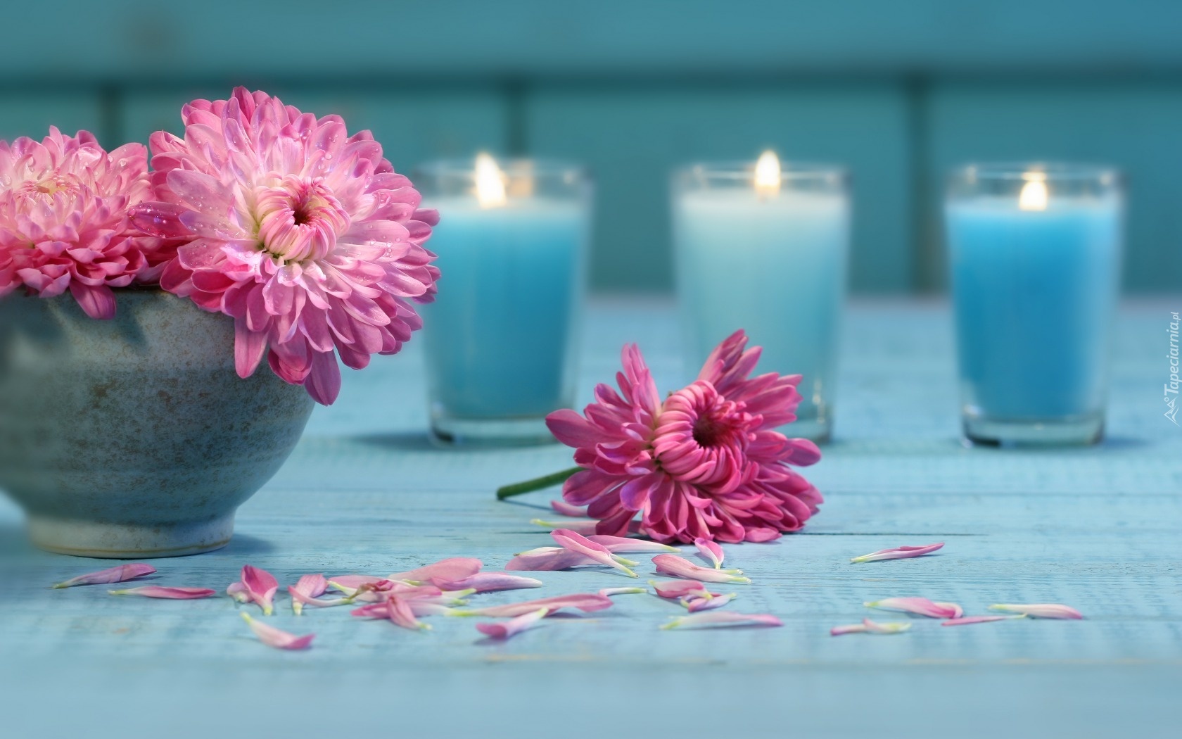 Edytor tapety: Wazonik, Kwiaty, Płatki, Niebieskie, Świeczki, Dekoracja