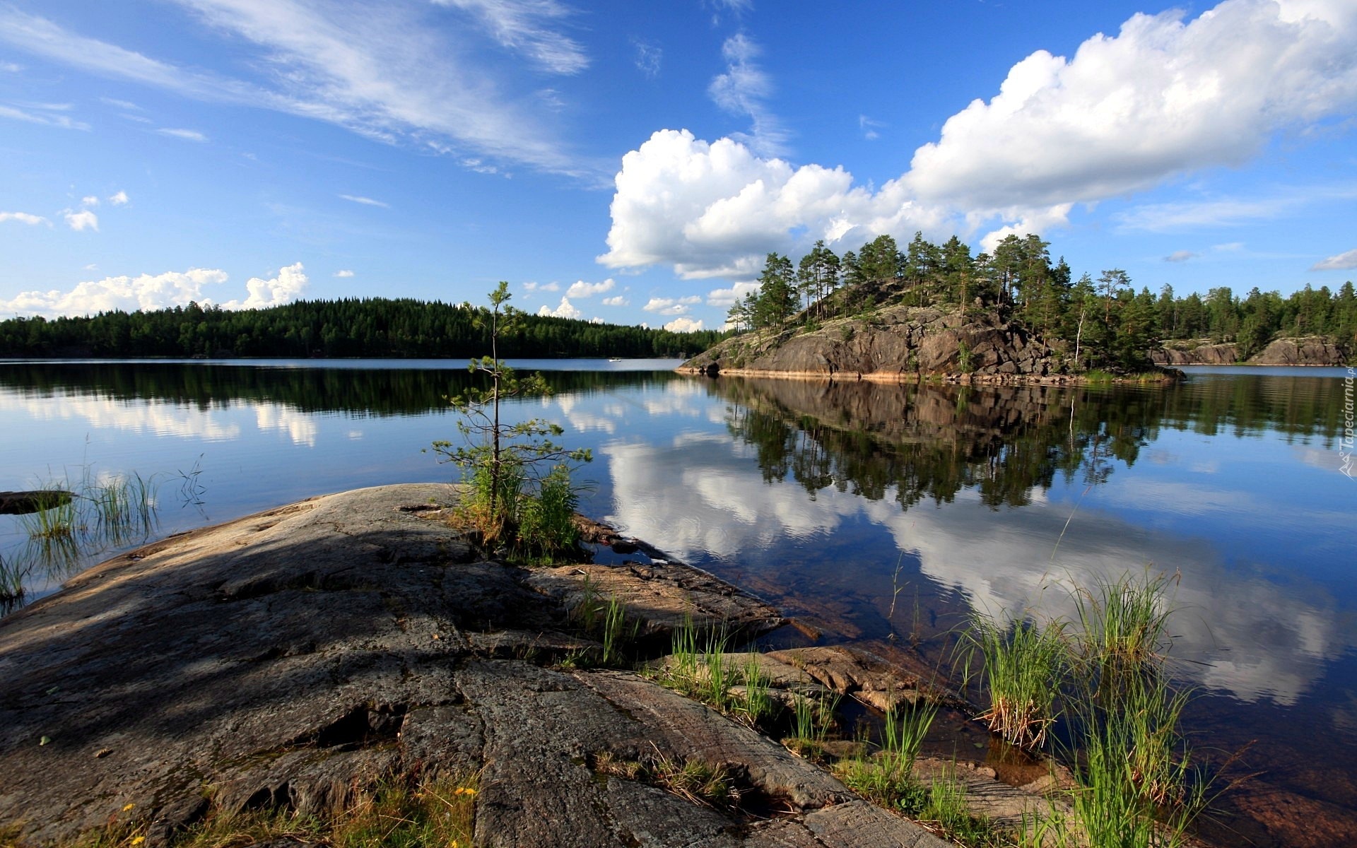 Edytor tapety: Niebo, Chmury, Rzeka, Wyspa, Kamienie, Skały, Las