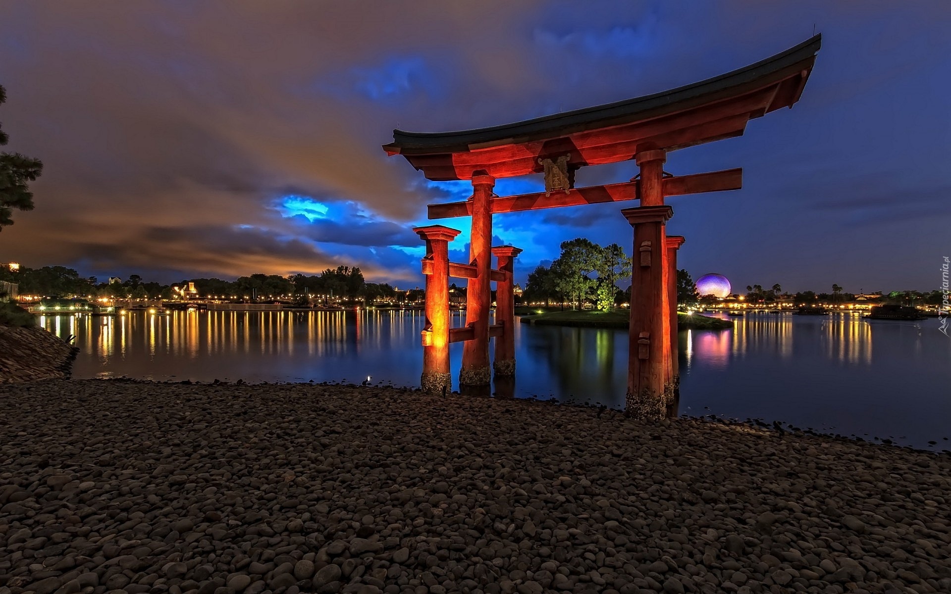 Edytor tapety: Japońska, Budowla, Rzeka, Brzeg, Kamienie, Wieczór, Światła, Odbicie