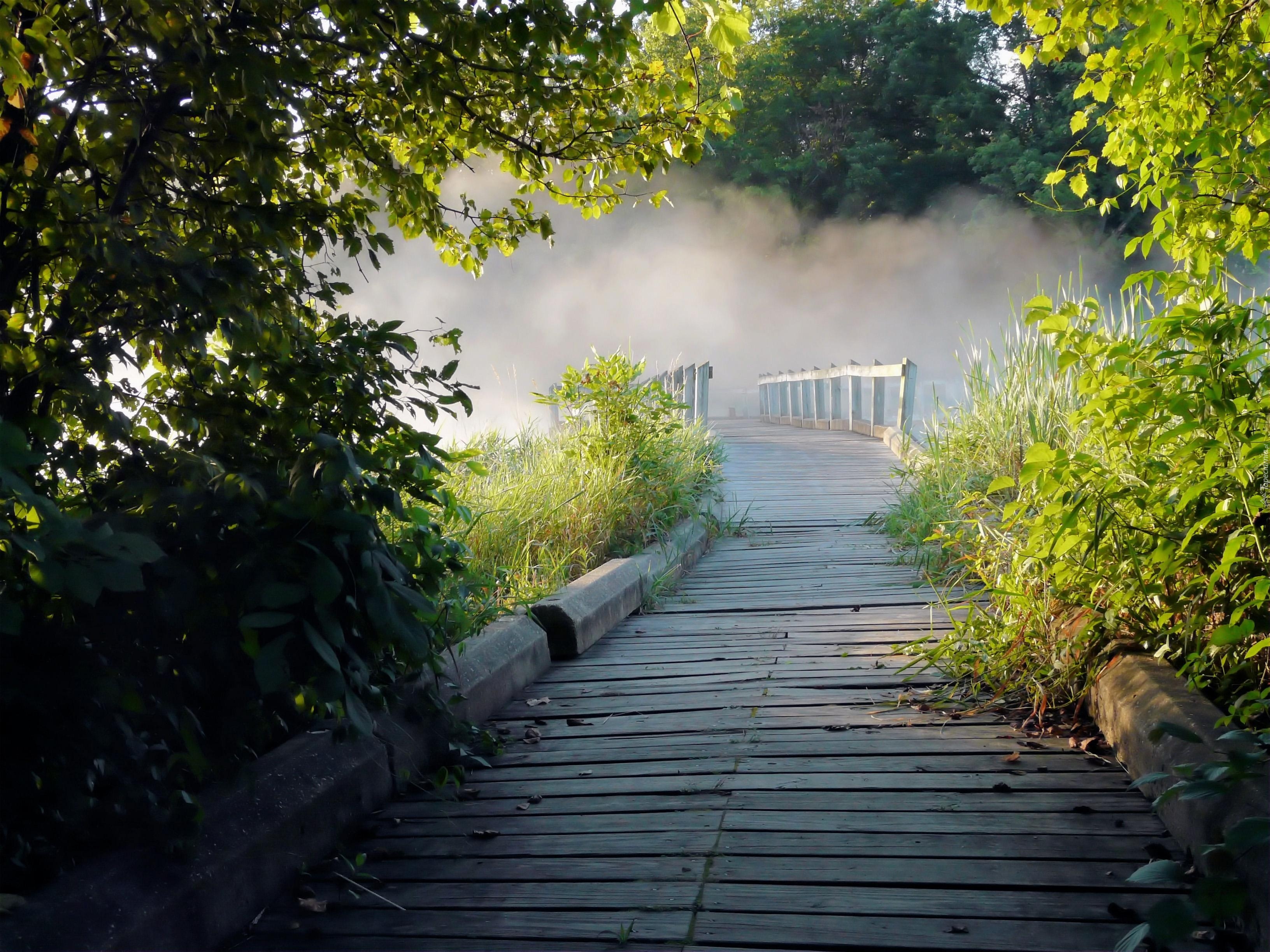 Edytor tapety: Droga, Drzewa, Mostek, Mgła, Poranek
