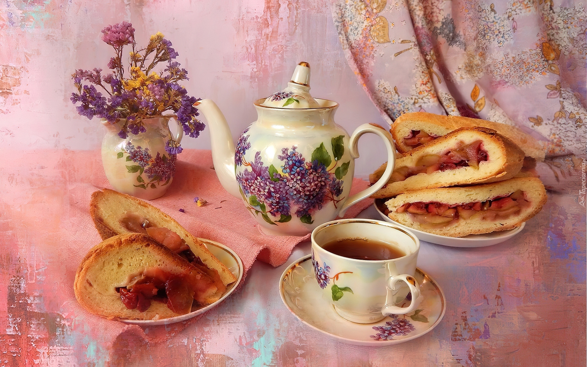 Edytor tapety: Dzbanek, Filiżanka, Herbata, Ciasto, Wazonik, Polne, Kwiatki