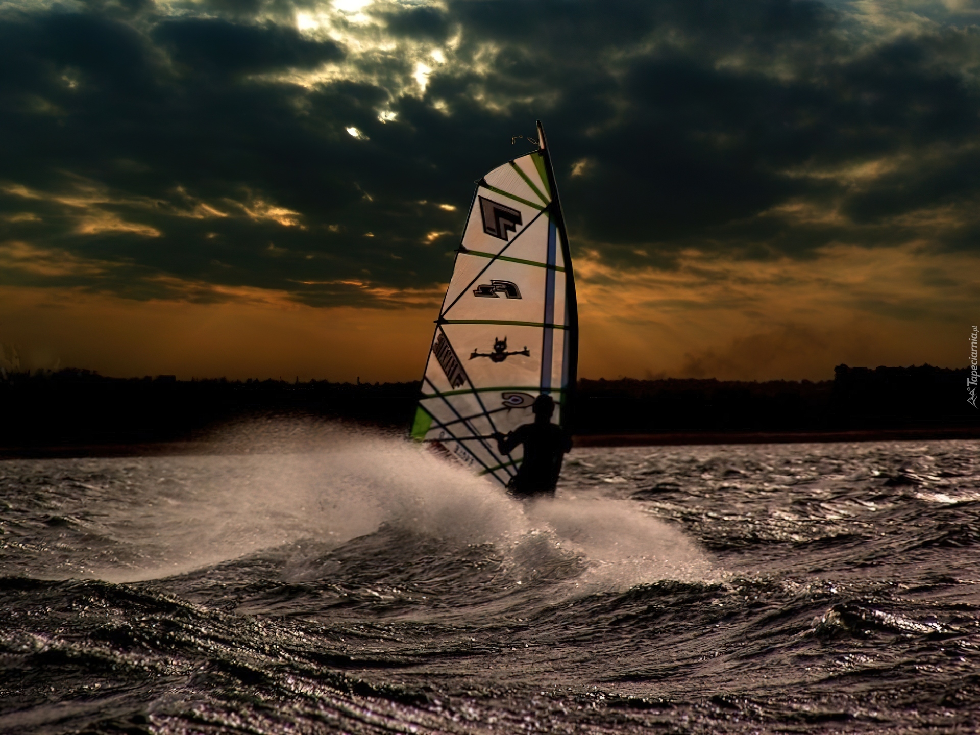 Edytor tapety: Windsurfing,deska, żagiel , morze,fala Zachód Słońca