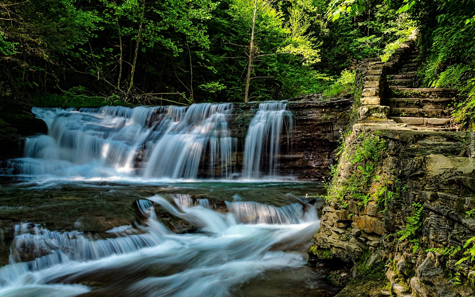 Edytor tapety: Las, Skały Wodospad, Zieleń