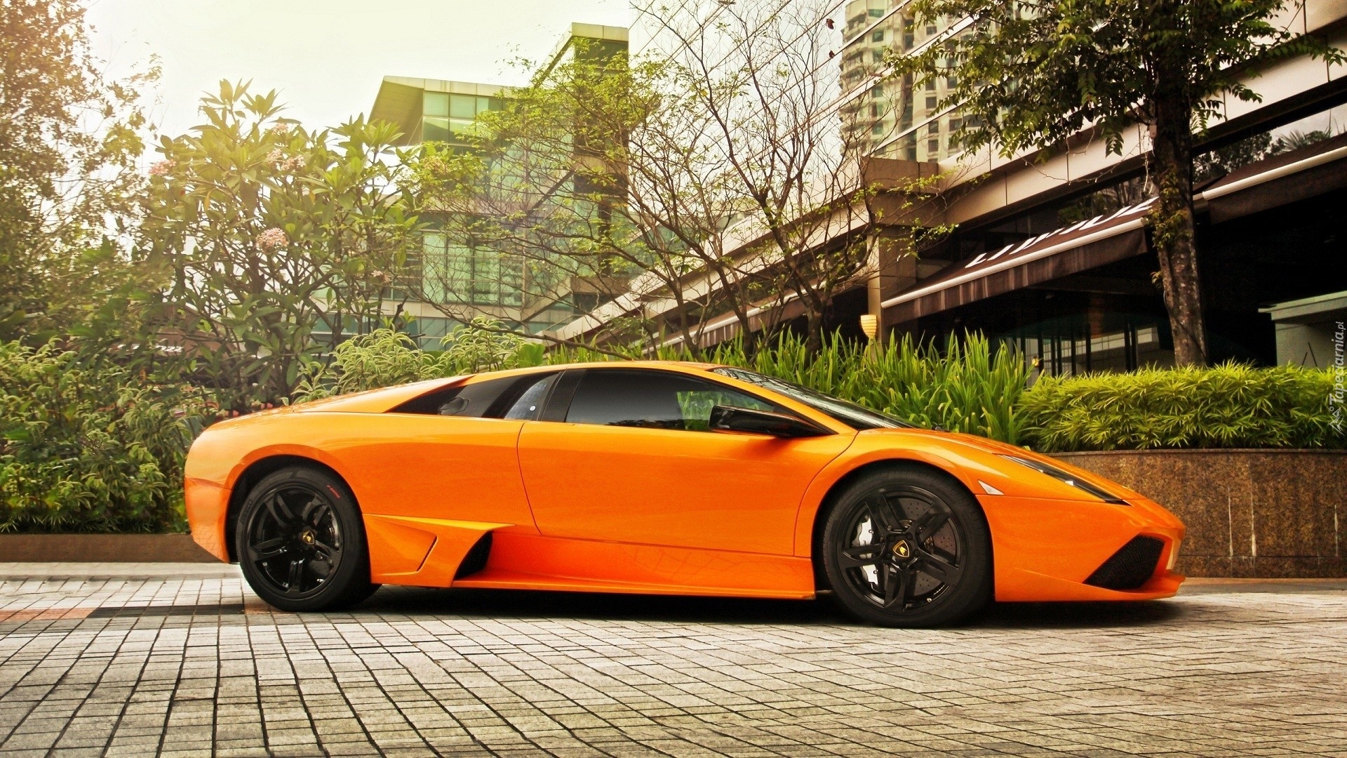 Edytor tapety: Lamborghini, Murcielago, Dom, Drzewa