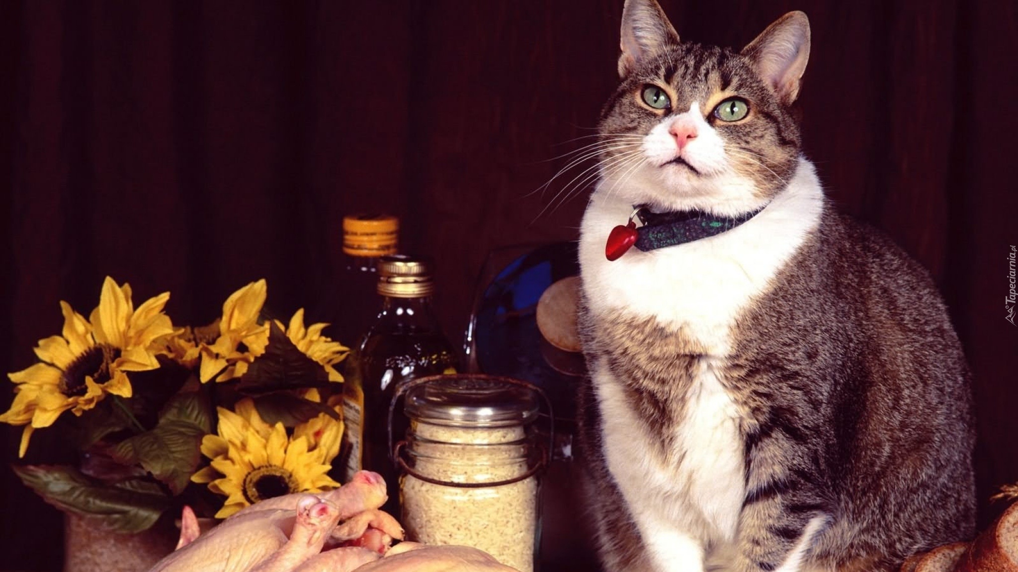 Edytor tapety: Gruby, Kot, Jedzenie, Kurczak, Bukiet, Kwiaty