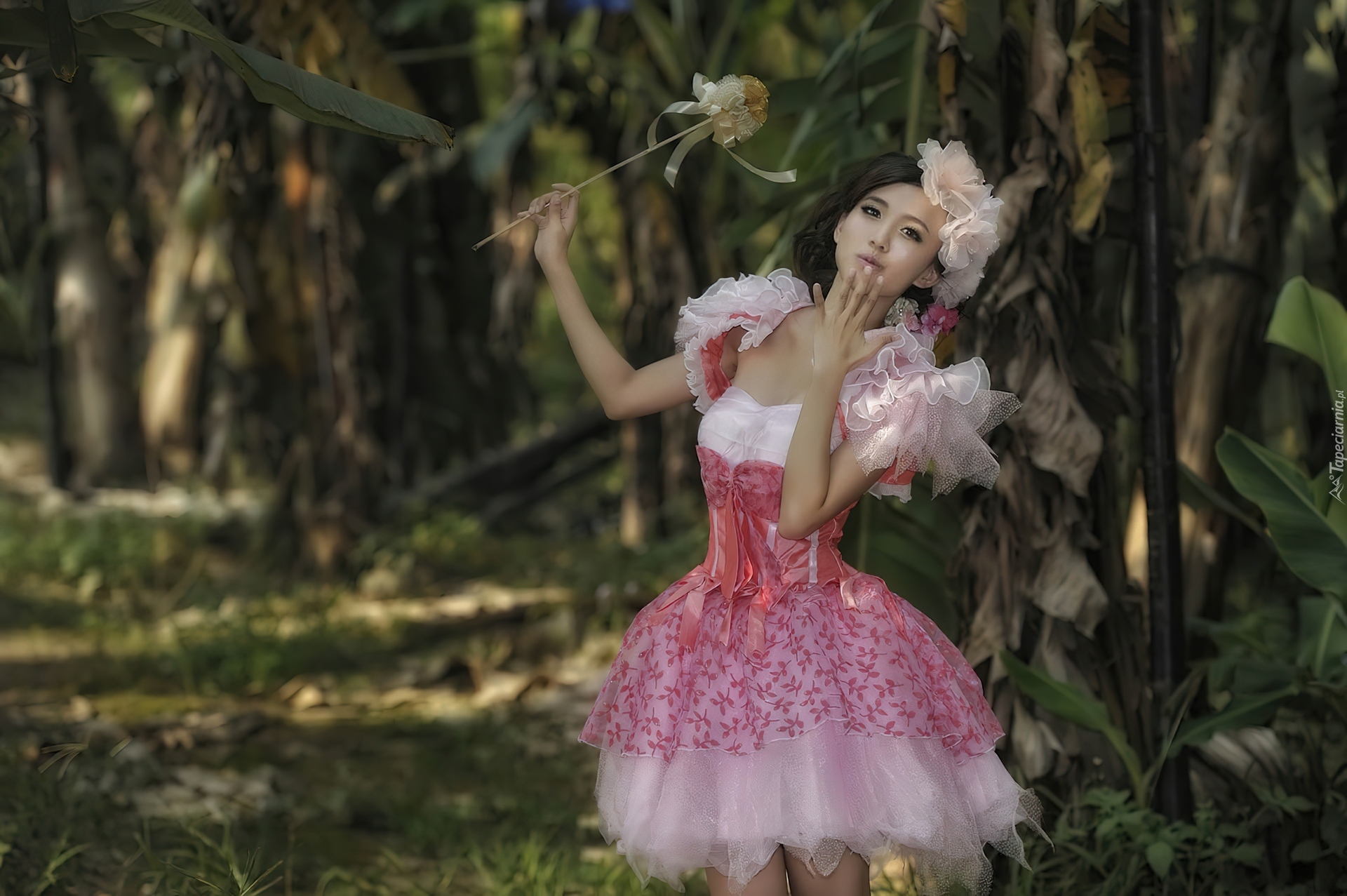 Edytor tapety: Brunetka, Moda, Styl, Sukienka, Falbanki, Las