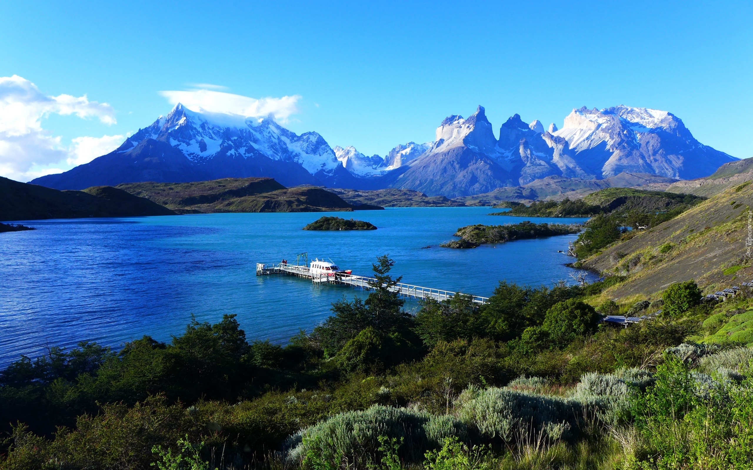 Edytor tapety: Jezioro, Wyspy, Molo, Góry, Roślinność