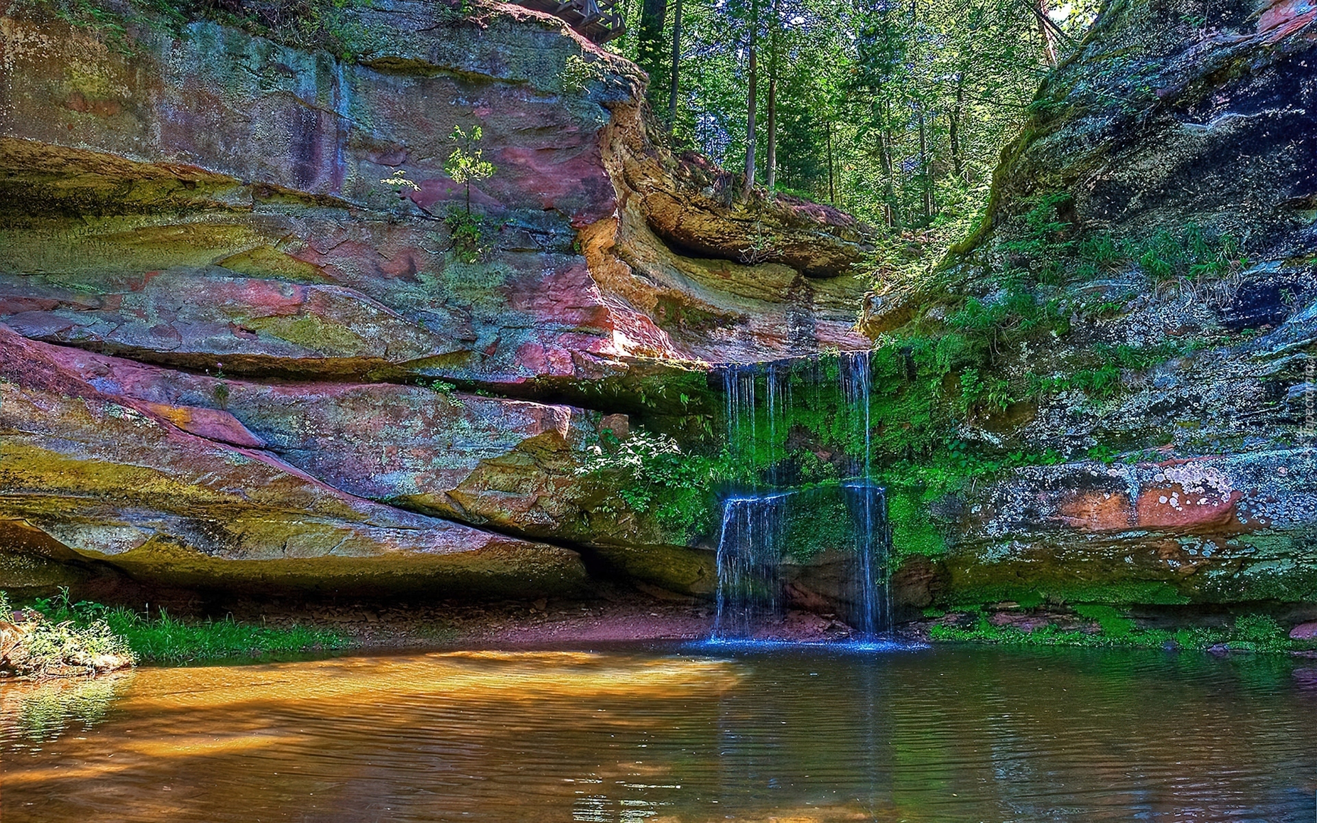 Edytor tapety: Wodospad, Kolorowe, Skały, Las