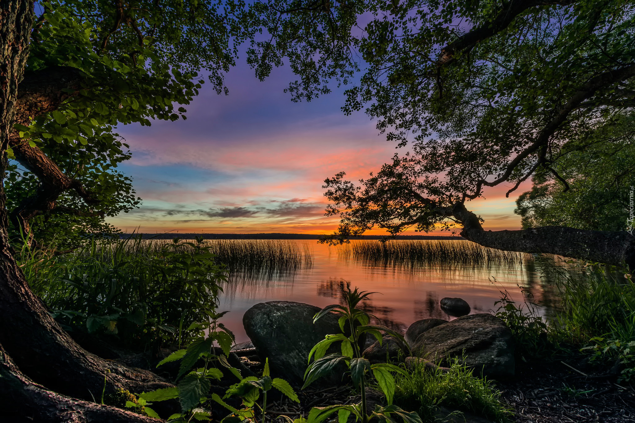 Edytor tapety: Jezioro, Kamienie, Trzciny, Drzewa, Zachód, Słońca