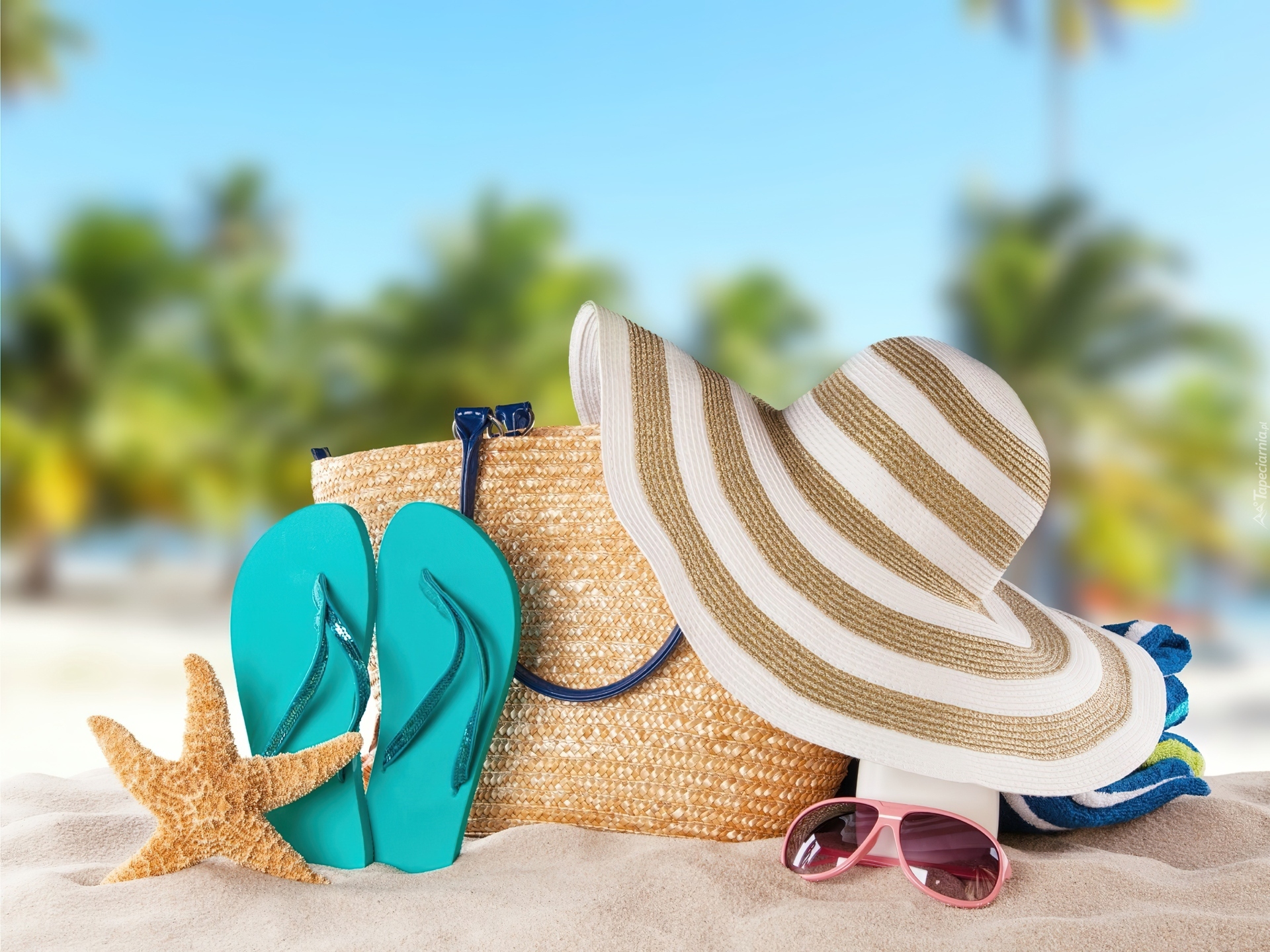 Edytor tapety: Plaża, Kapelusz, Okulary, Rozgwiazda, Palmy, Tropiki, Lato