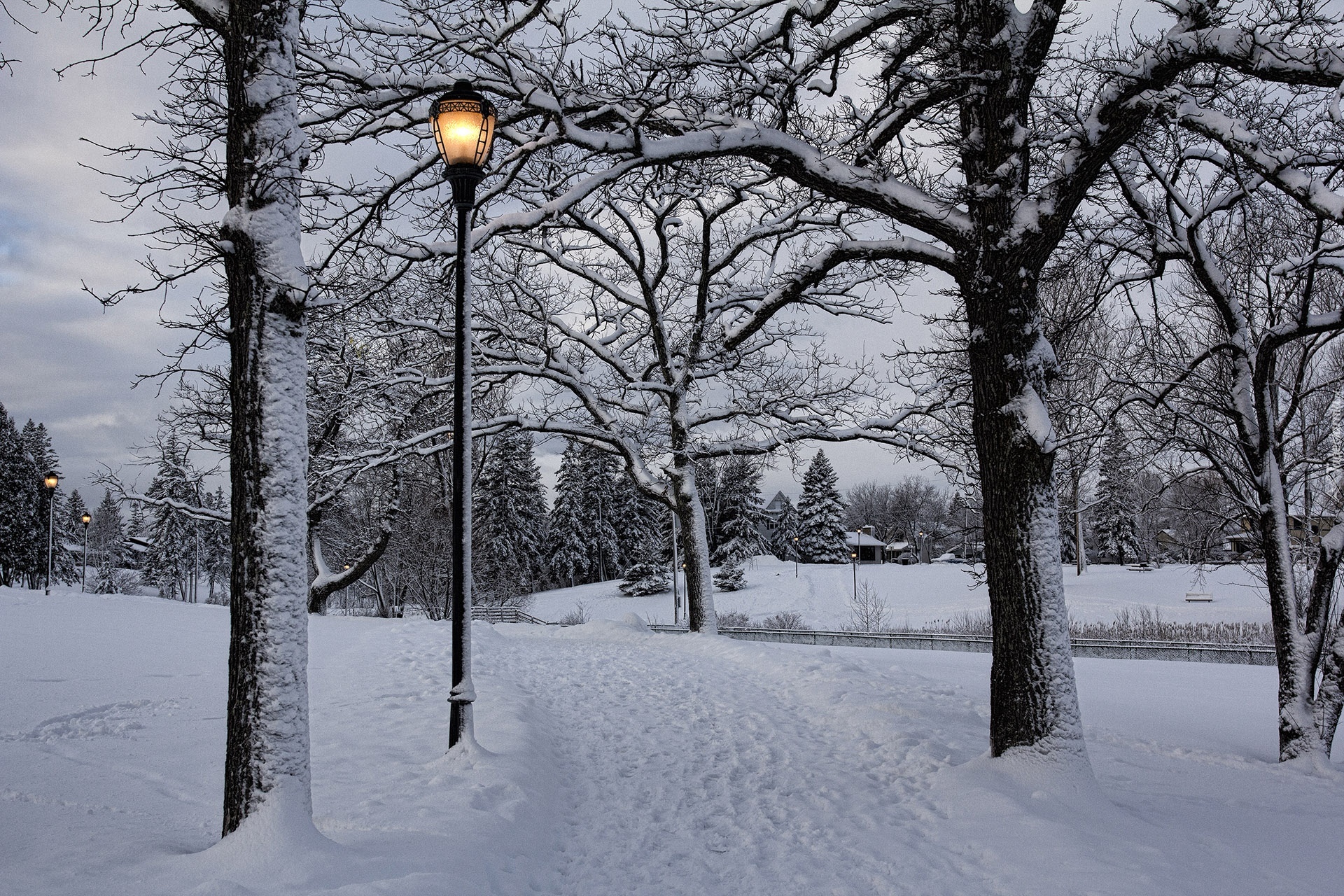 Edytor tapety: Zima, Park, Latarnie, Drzewa