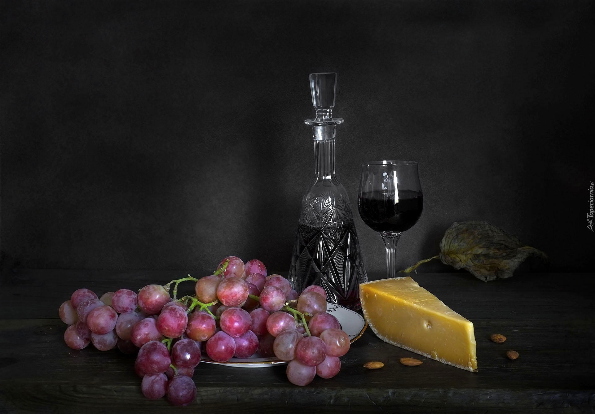 Edytor tapety: Kompozycja, Ser, Winogrona, Karafka, Kieliszek, Wino