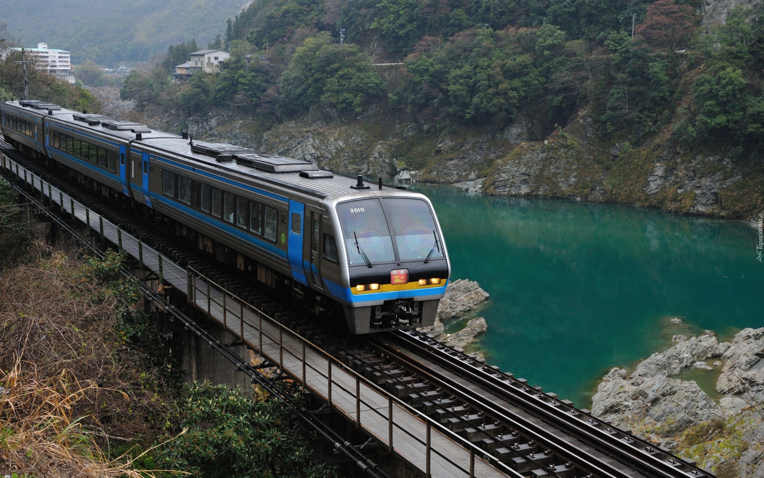 Edytor tapety: Pociąg, Most, Domy, Las, Skały, Rzeka