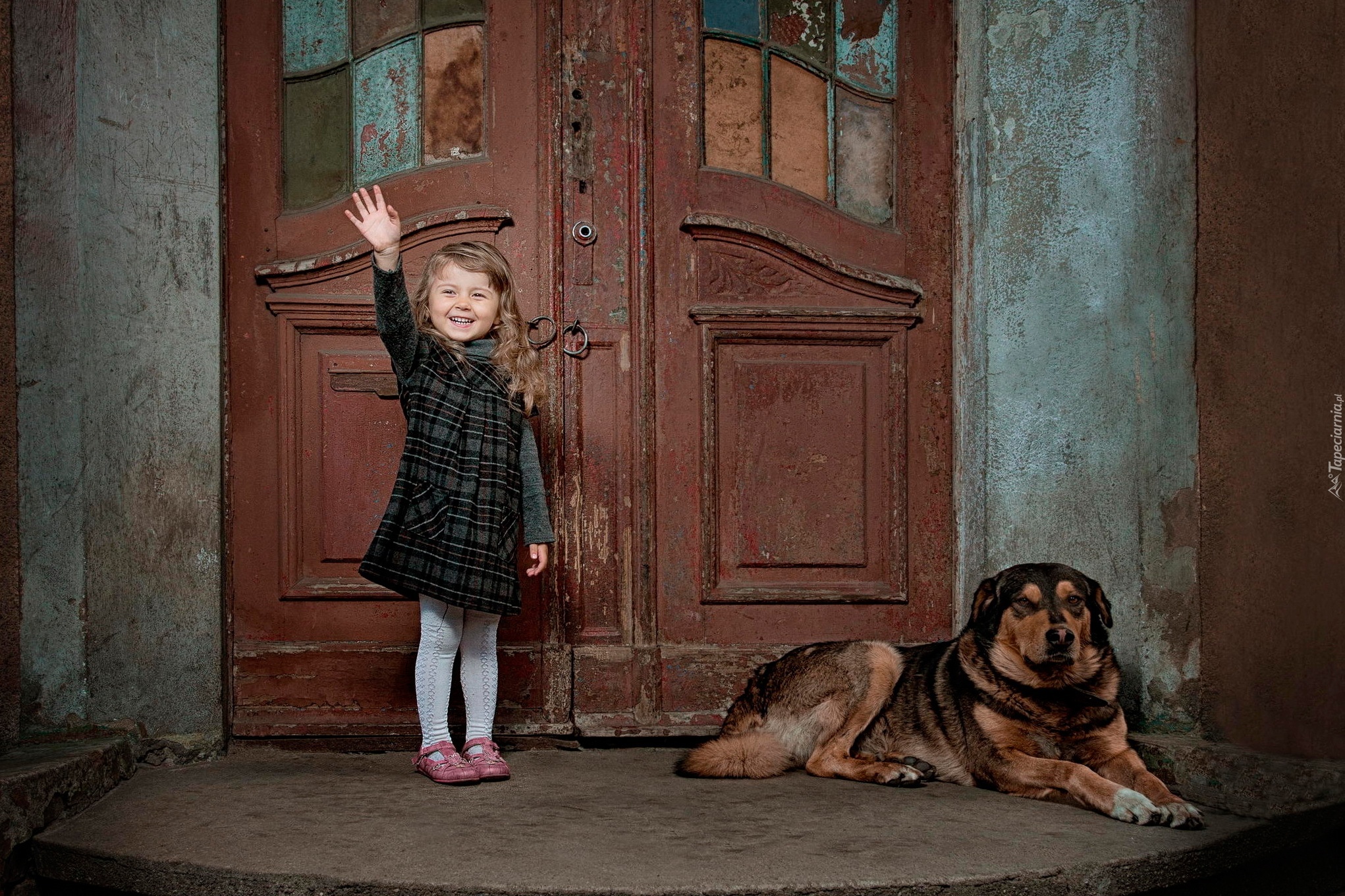 Edytor tapety: Dziecko, Dziewczynka, Leżący, Pies, Stare, Drzwi