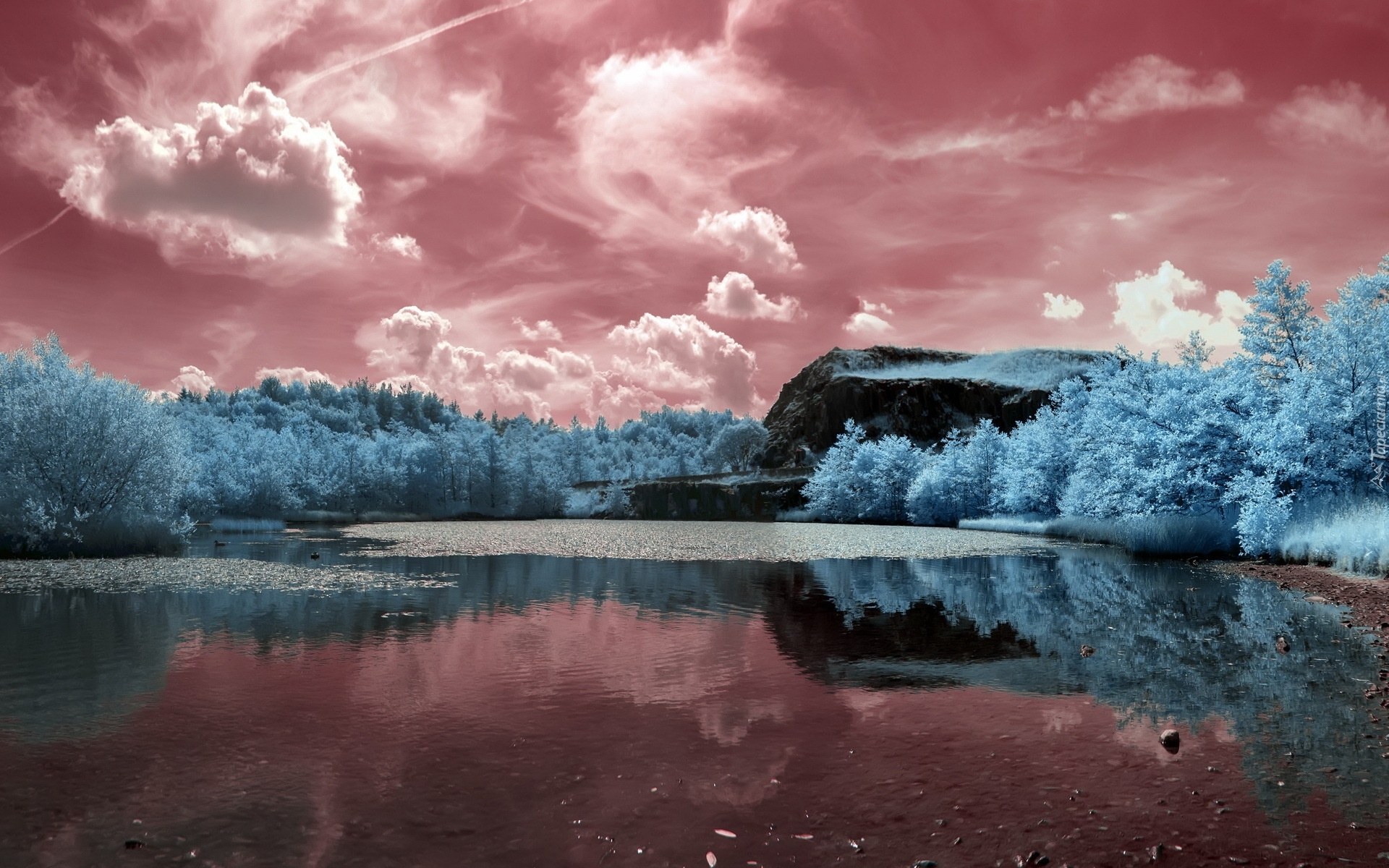 Edytor tapety: Rzeka, Drzewa, Skała, Chmury