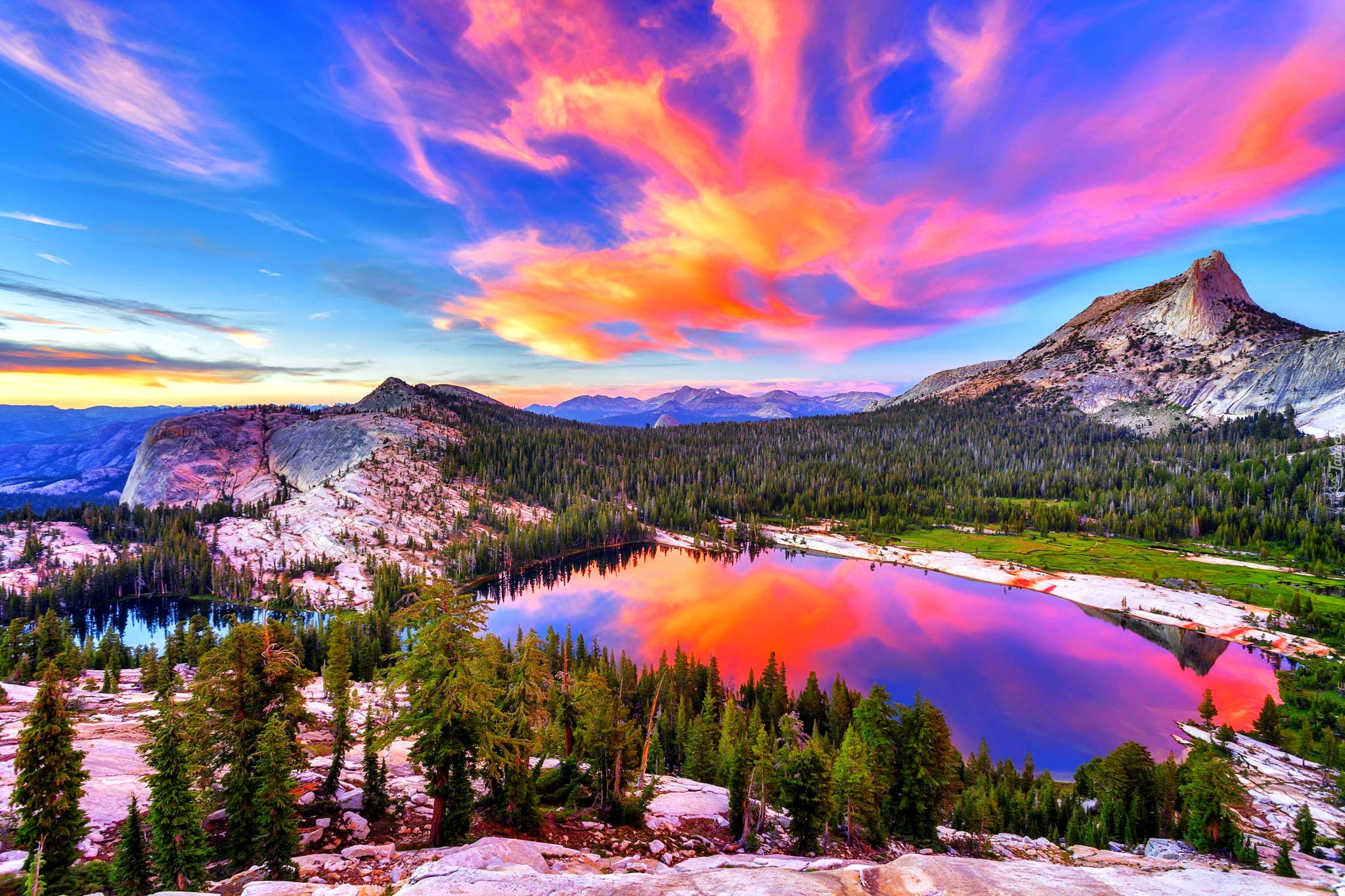 Edytor tapety: Góry, Lasy, Jezioro, Purpurowe Chmury, Odbicie