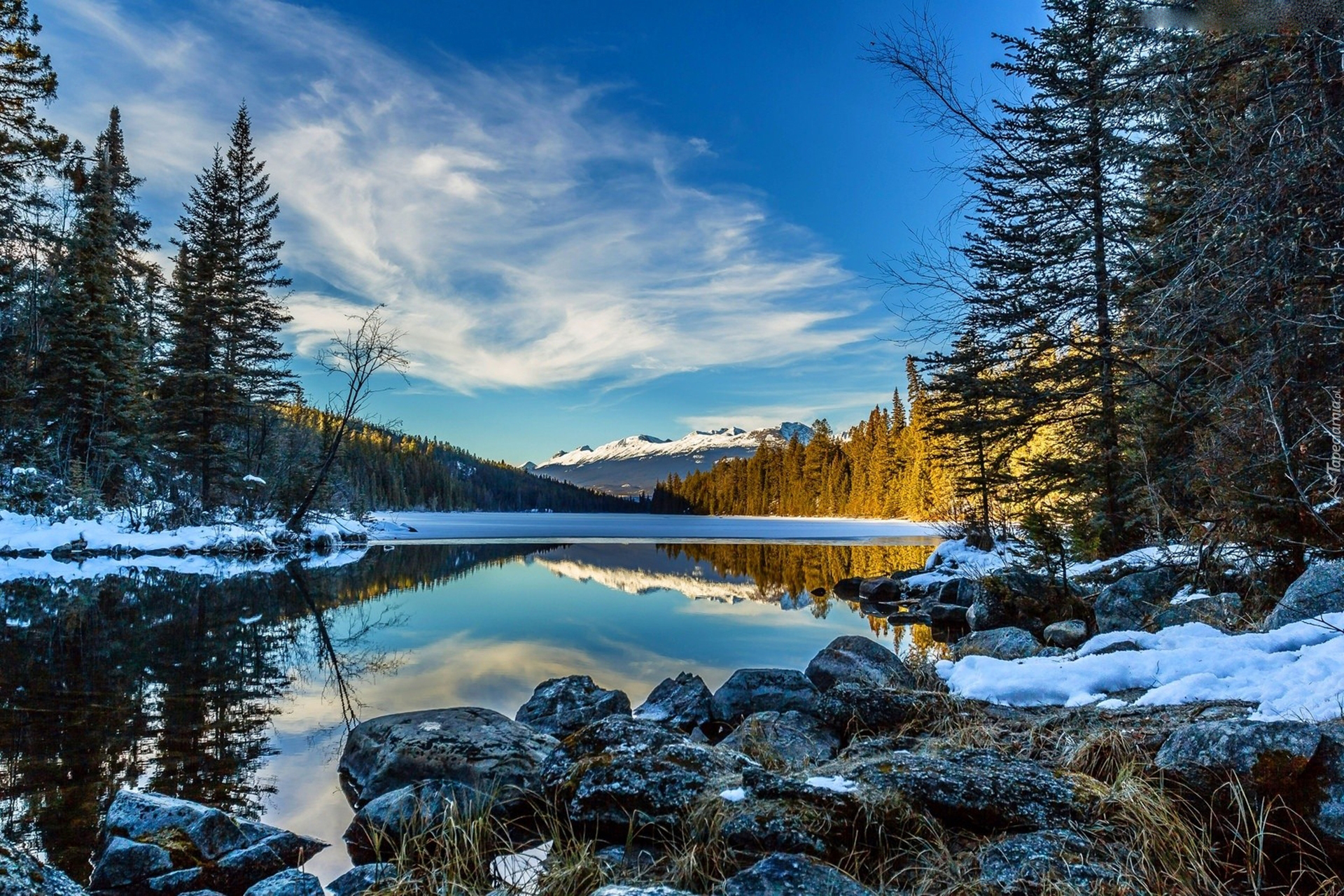 Edytor tapety: Jezioro, Kamienie, Góry, Lasy, Zima