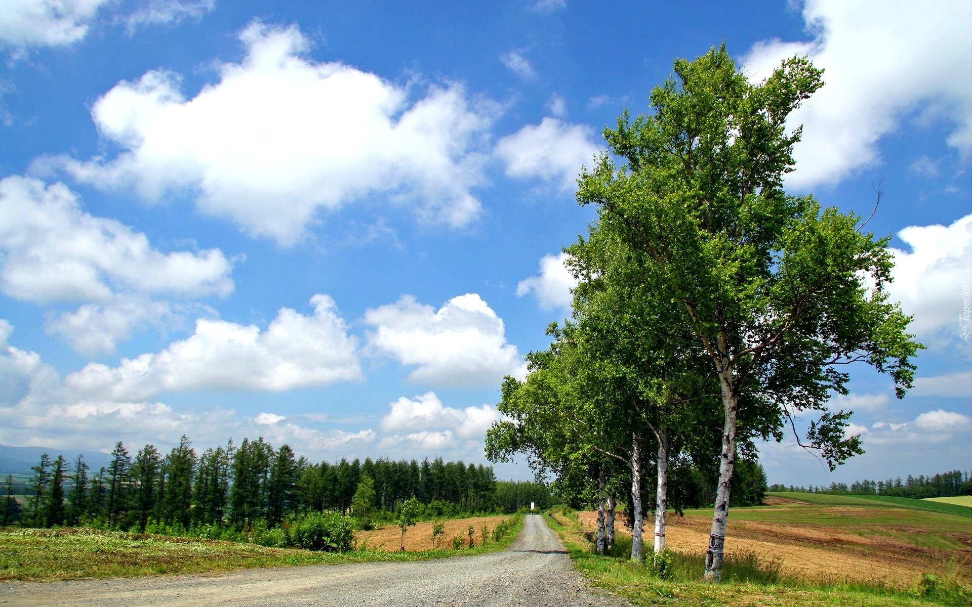 Edytor tapety: Droga, Pola, Drzewa, Niebo