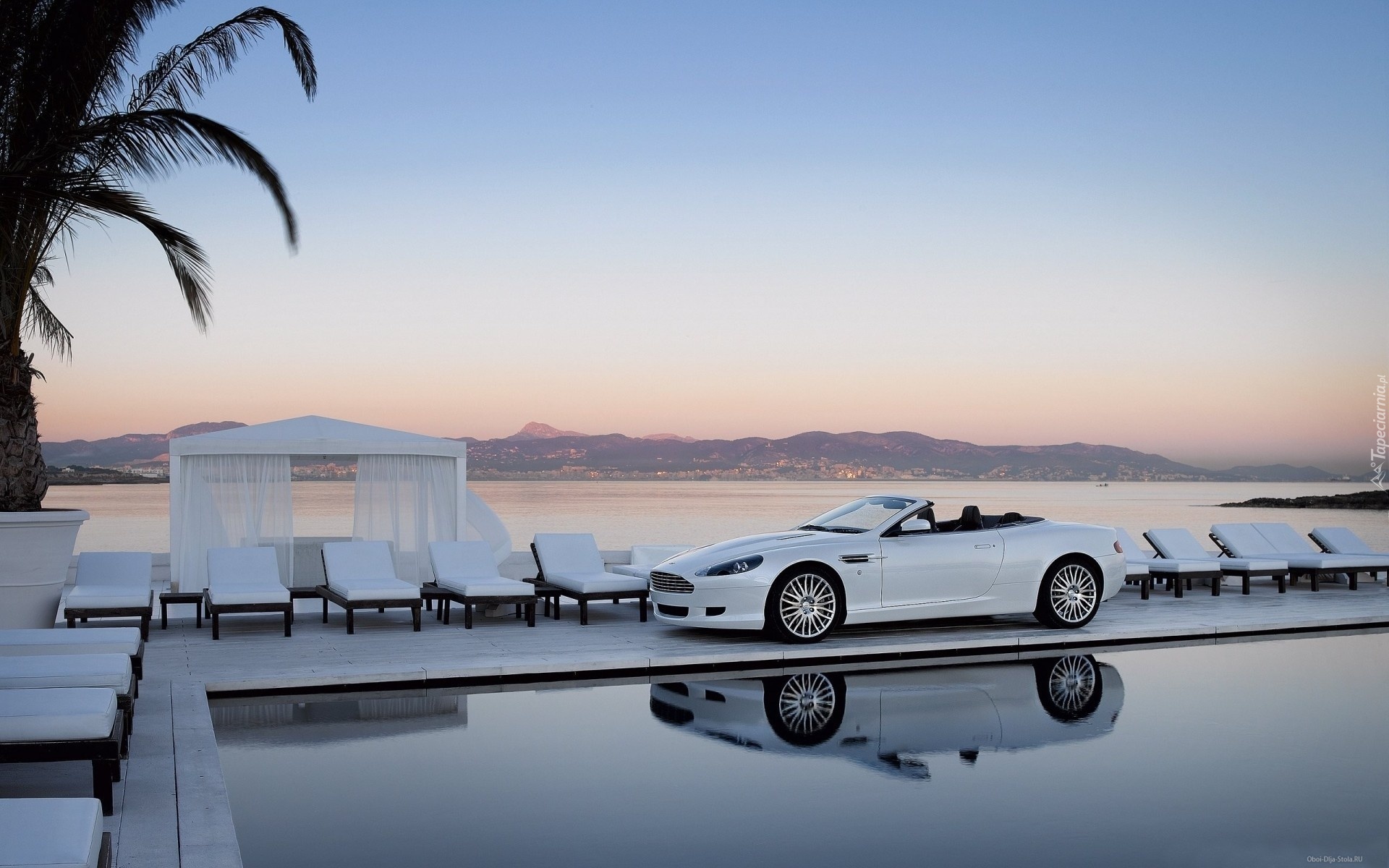 Edytor tapety: Samochód, Aston Martin, DB9, Basen, Leżaki, Palma, Morze