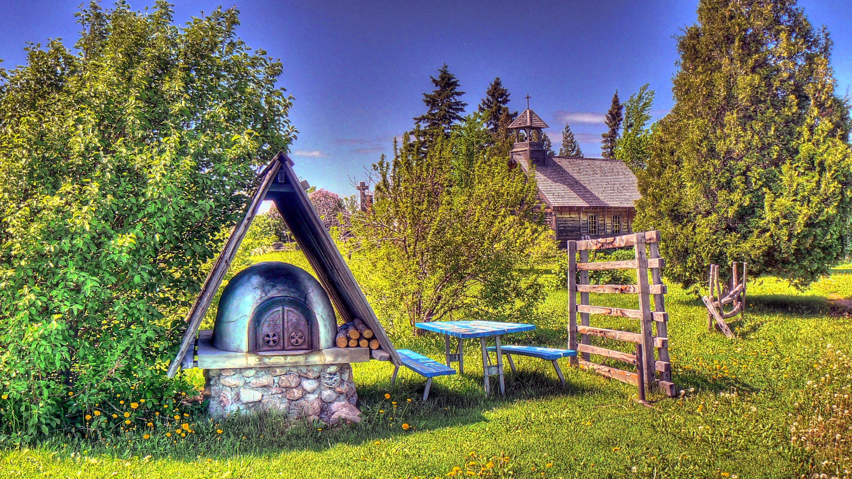 Edytor tapety: Kościół, Drzewa, Ławka, Studnia