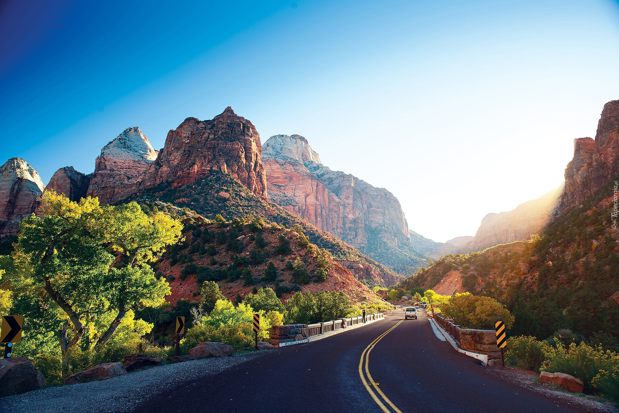 Edytor tapety: Góry, Droga, Samochód, Drzewa