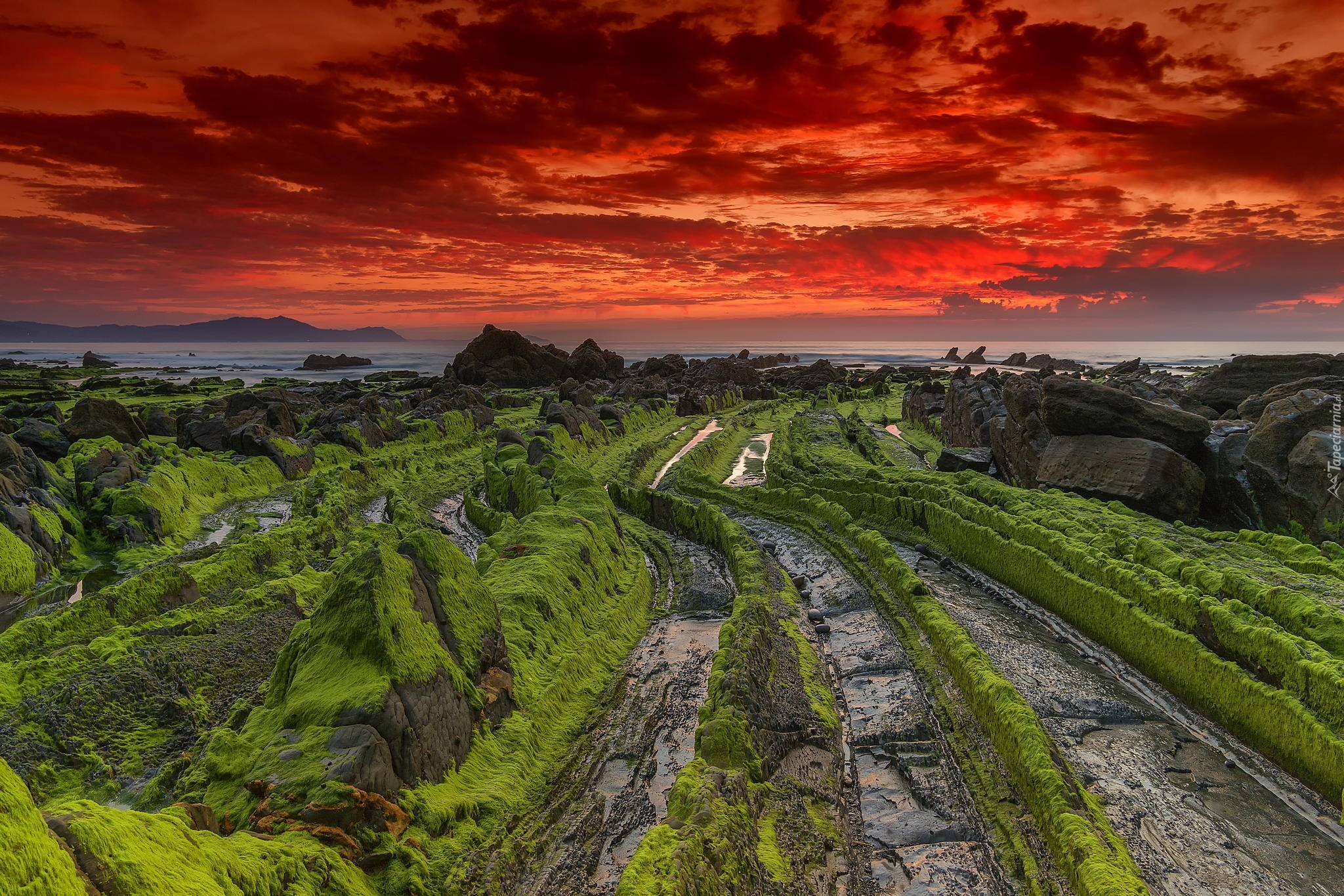 Edytor tapety: Zachód, Słońca, Morze, Skałki, Mech
