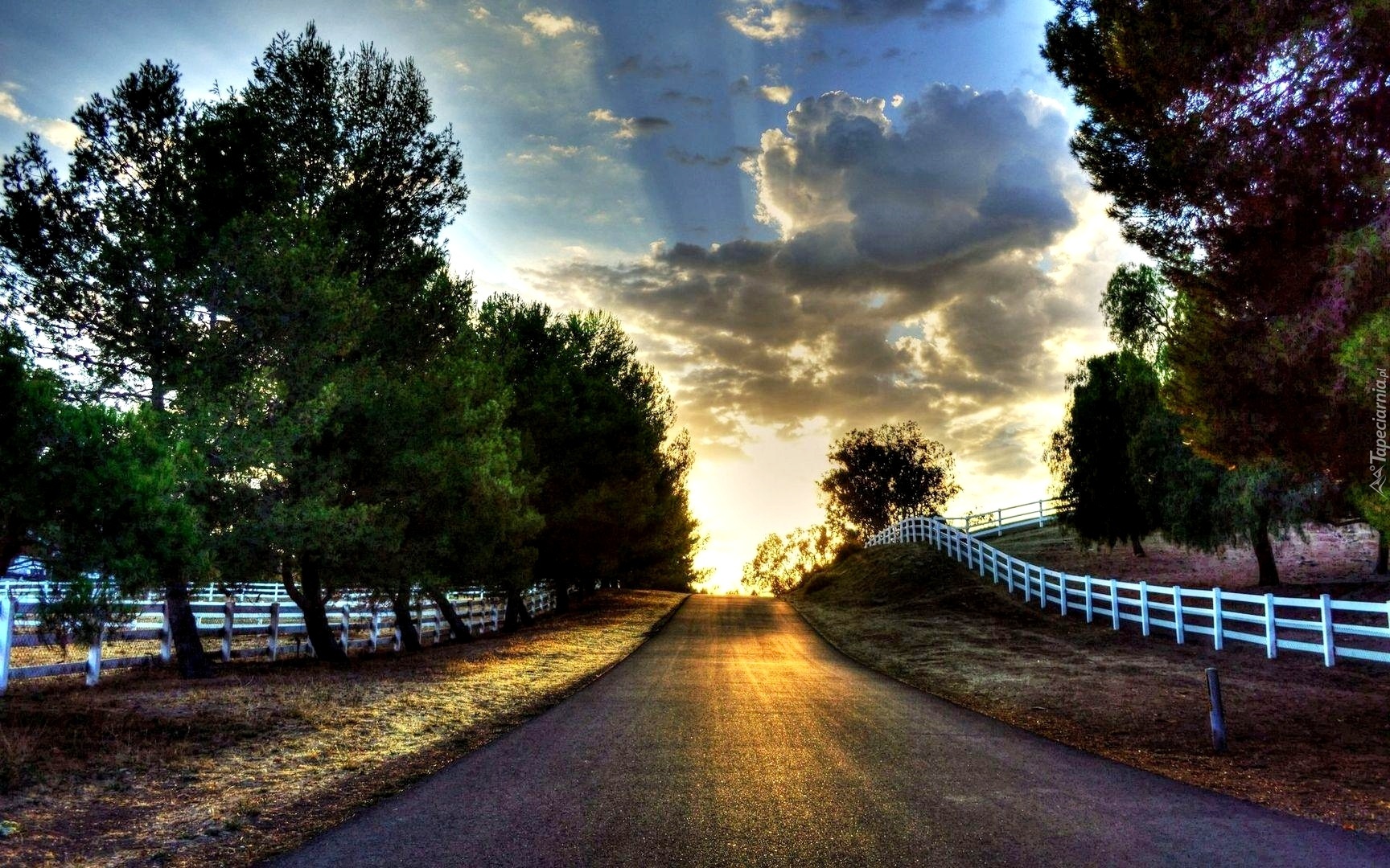 Edytor tapety: Droga, Chmury, Przebijające, Światło, Ogrodzenie, Drzewa