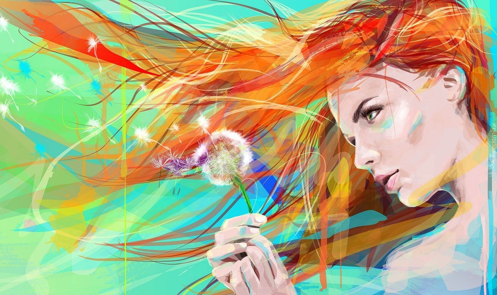 Edytor tapety: Grafika, Art, Rudowłosa, Dziewczyna, Dmuchawiec, Mniszek
