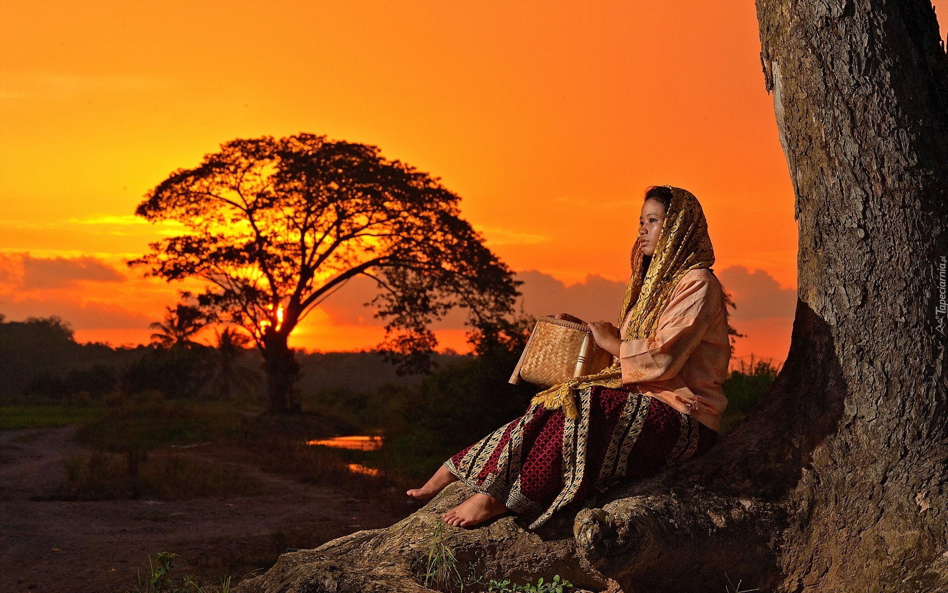 Edytor tapety: Siedząca, Kobieta, Zachód, Słońca, Drzewa, Chustka, Torebka