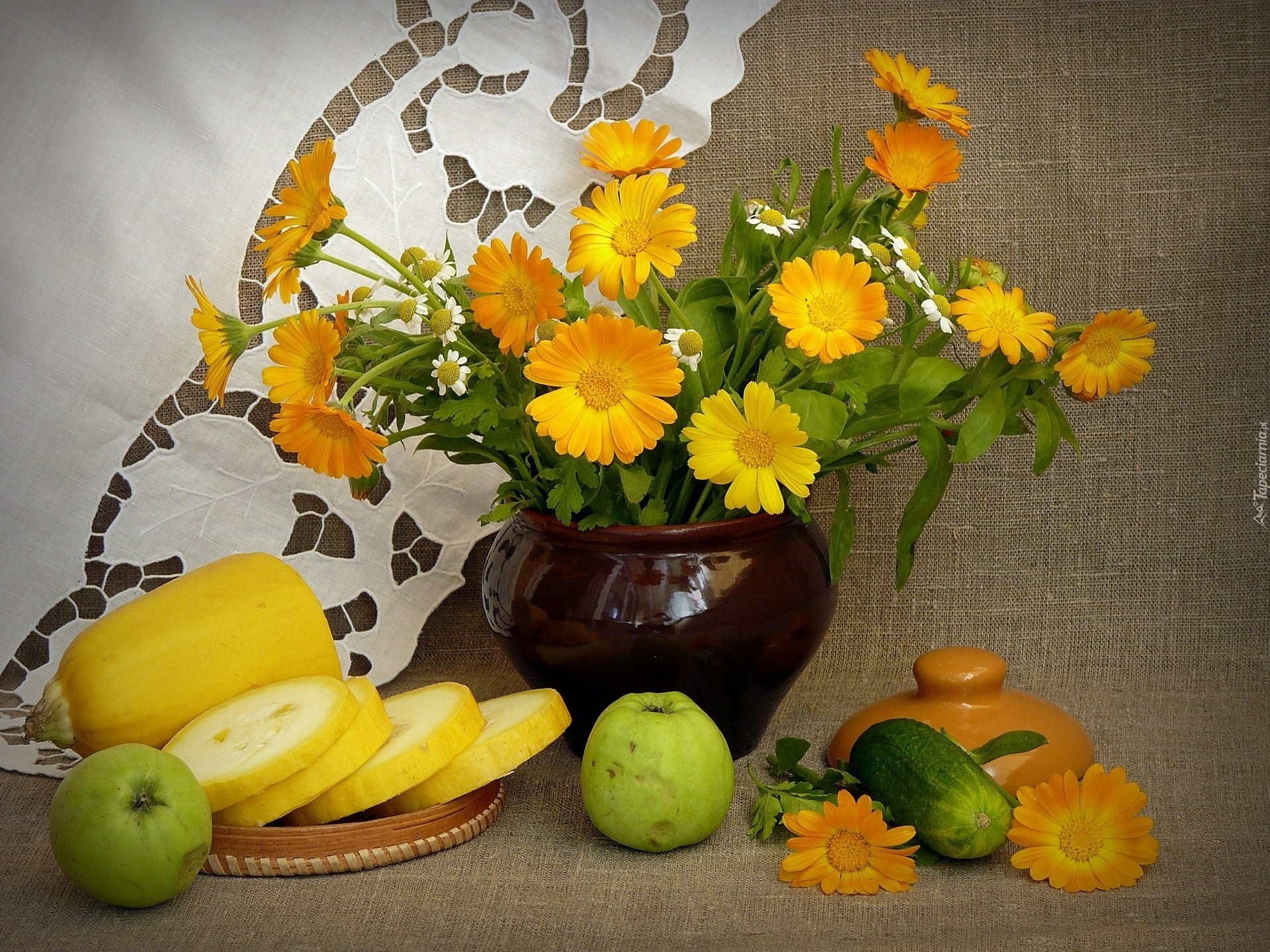 Edytor tapety: Kwiaty, Flakon, Jabłka Kompozycja