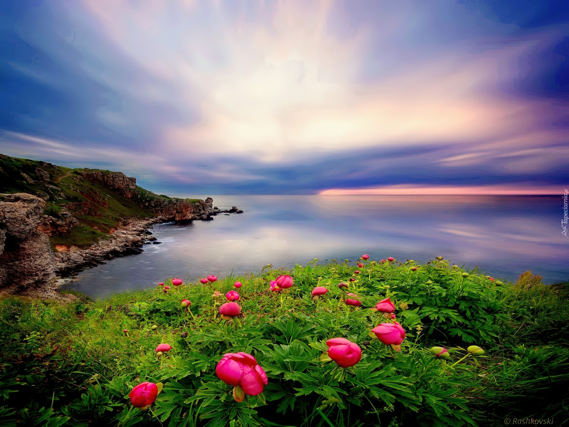 Edytor tapety: Morze, Zachód, Słońca, Piwonie