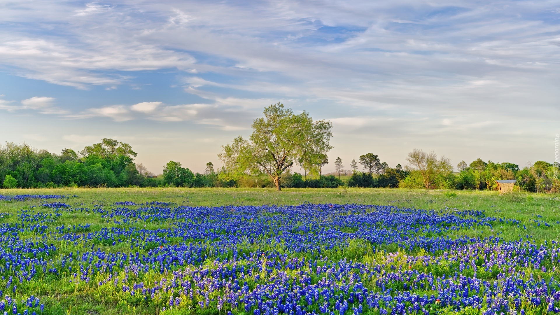 Edytor tapety: Łąka, Trawa, Niebieskie, Kwiaty, Drzewo