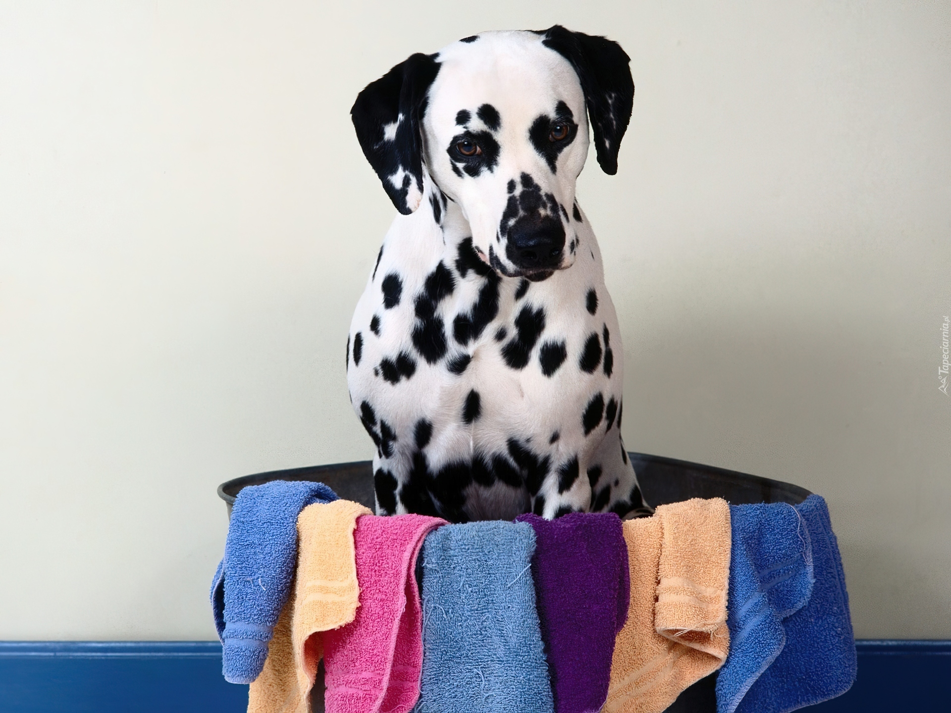 Edytor tapety: Pies, Dalmatyńczyk, Ręczniki, Miska